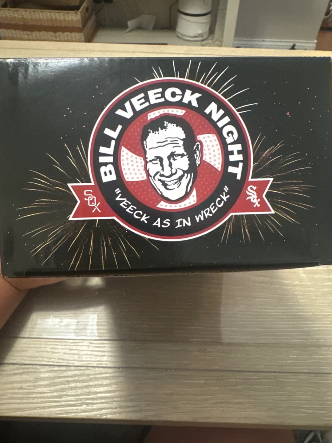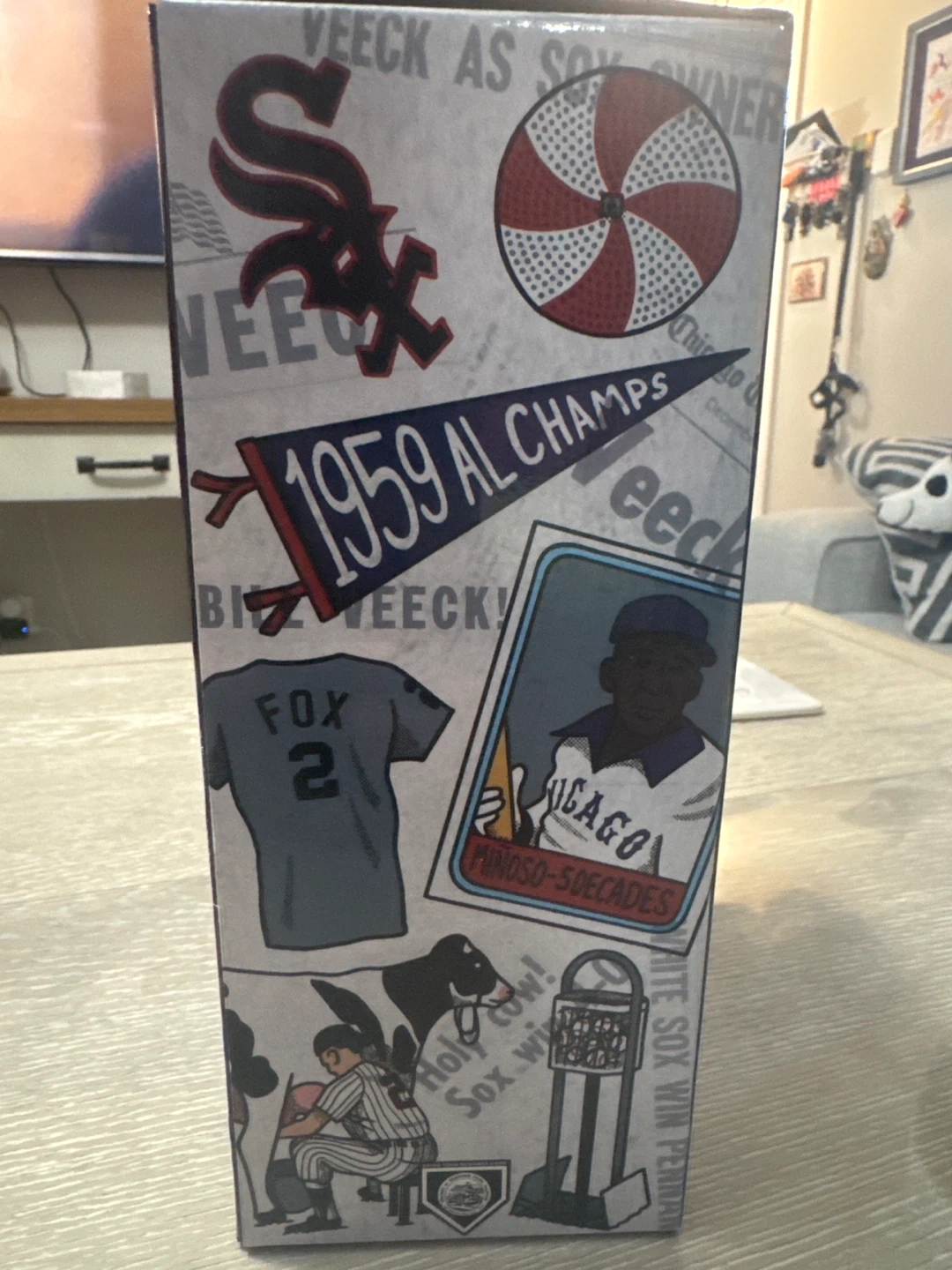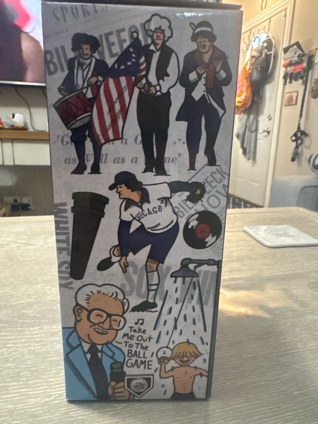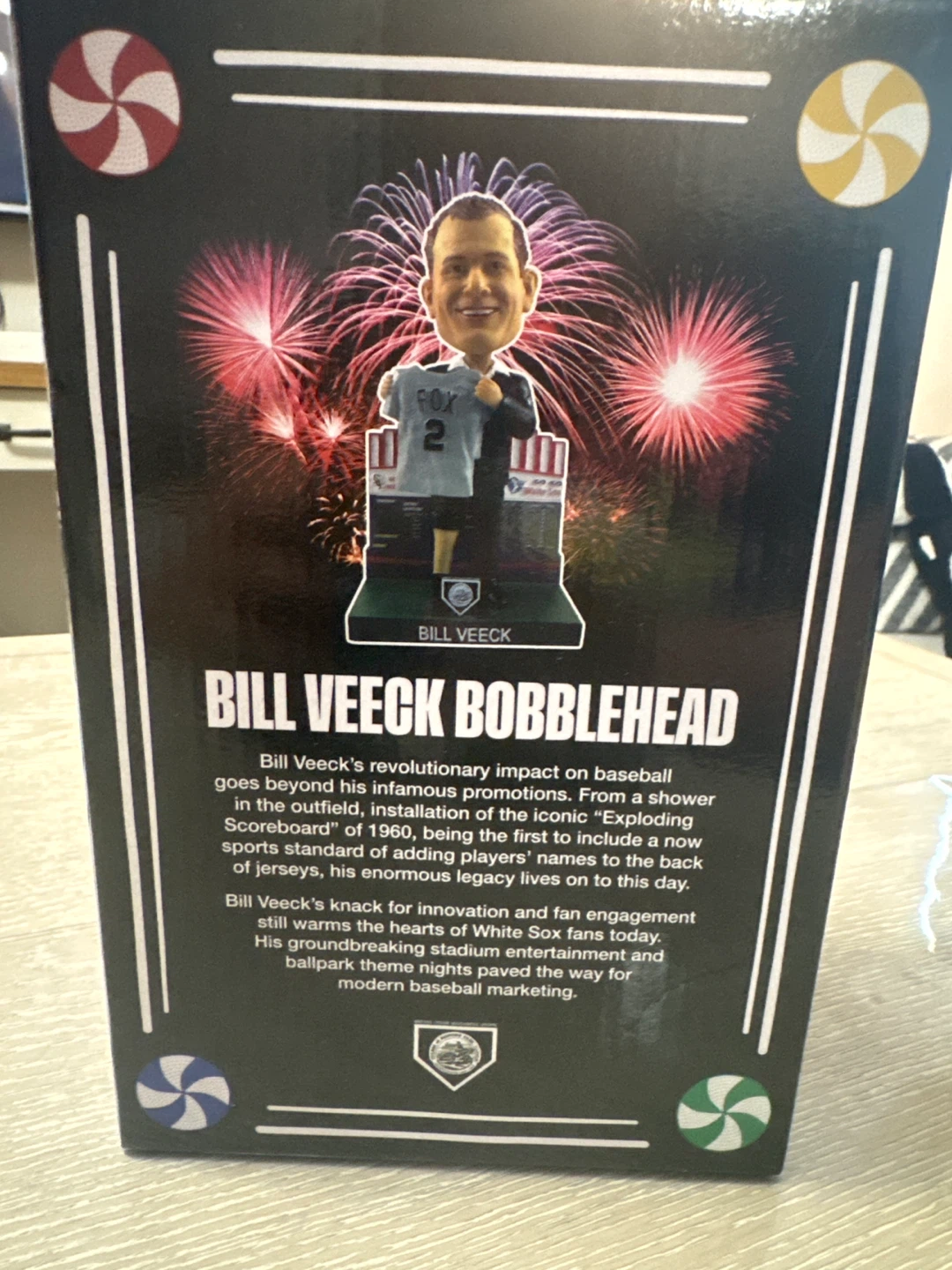 Selling a Bill Veeck Bobblehead, celebrating the iconic baseball figure and his impact on the Chicago White Sox! This bobblehead comes in its original box, featuring various images and designs related to Veeck's career and the White Sox history