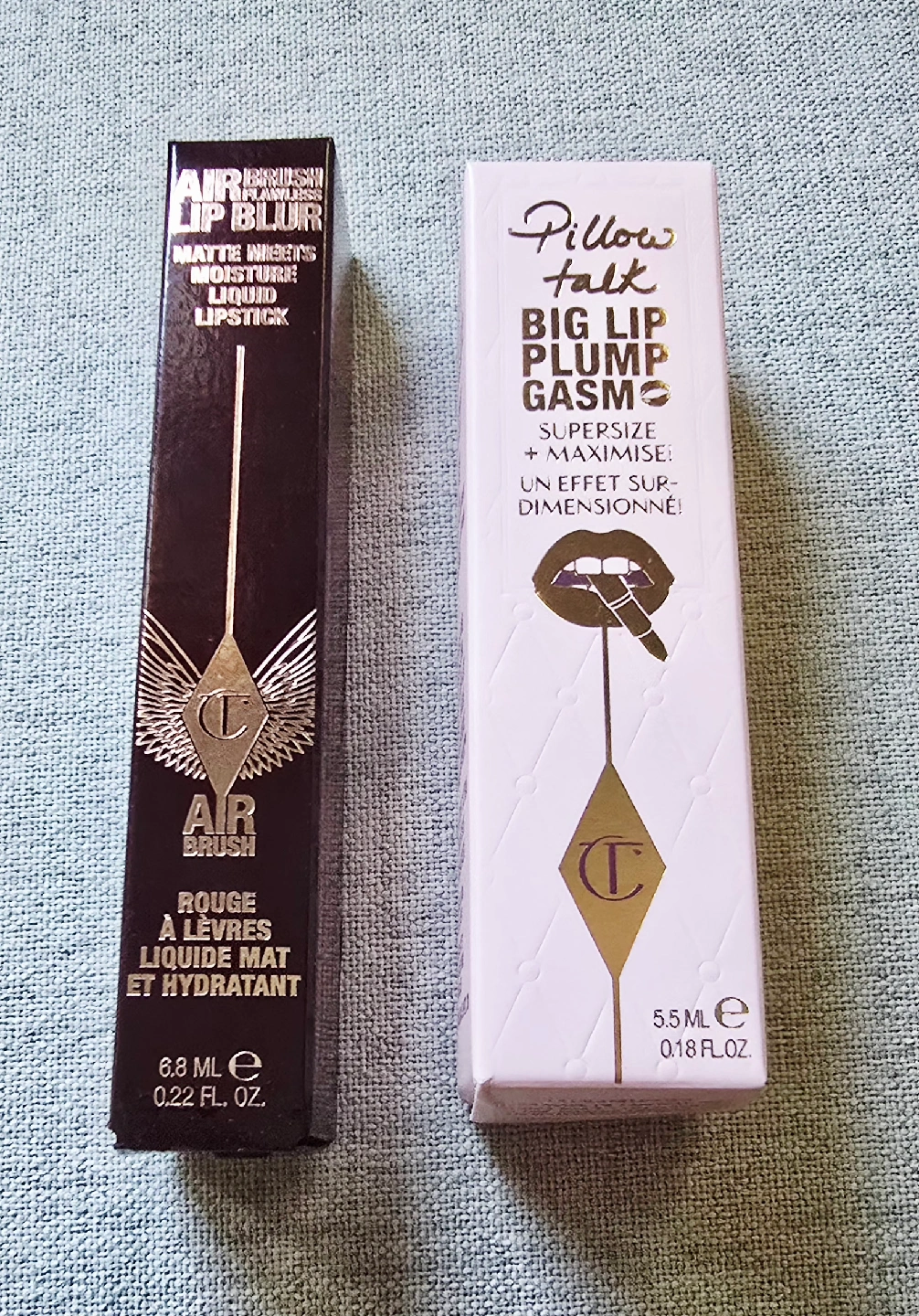 Price for both. New two Charlotte Tilbury lipsticks! One is the Airbrush Lip Blur Matte Meets Moisture Liquid Lipstick (6.8 ml / 0.22 fl. oz.) and the other is Pillow Talk Big Lip Plumpgasm (5.5 ml / 0.18 fl. oz.)