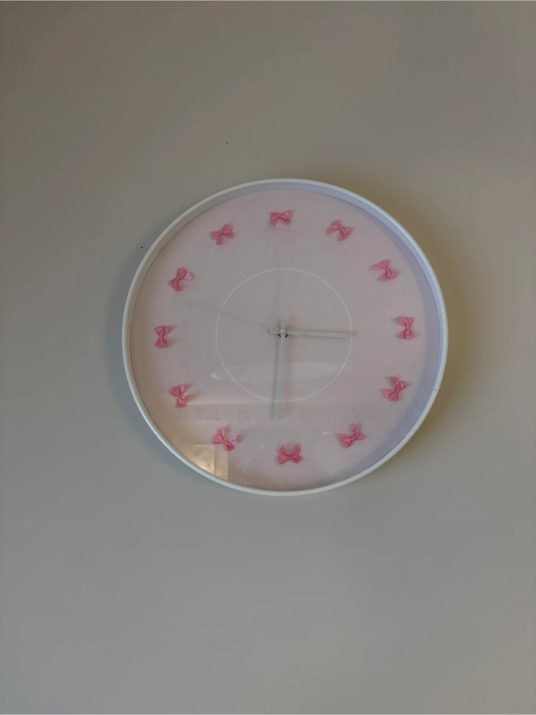 Here's a super cute wall clock with pink bows! It's perfect for a nursery or any room that needs a touch of sweetness. It's in great condition and ready to brighten up your space