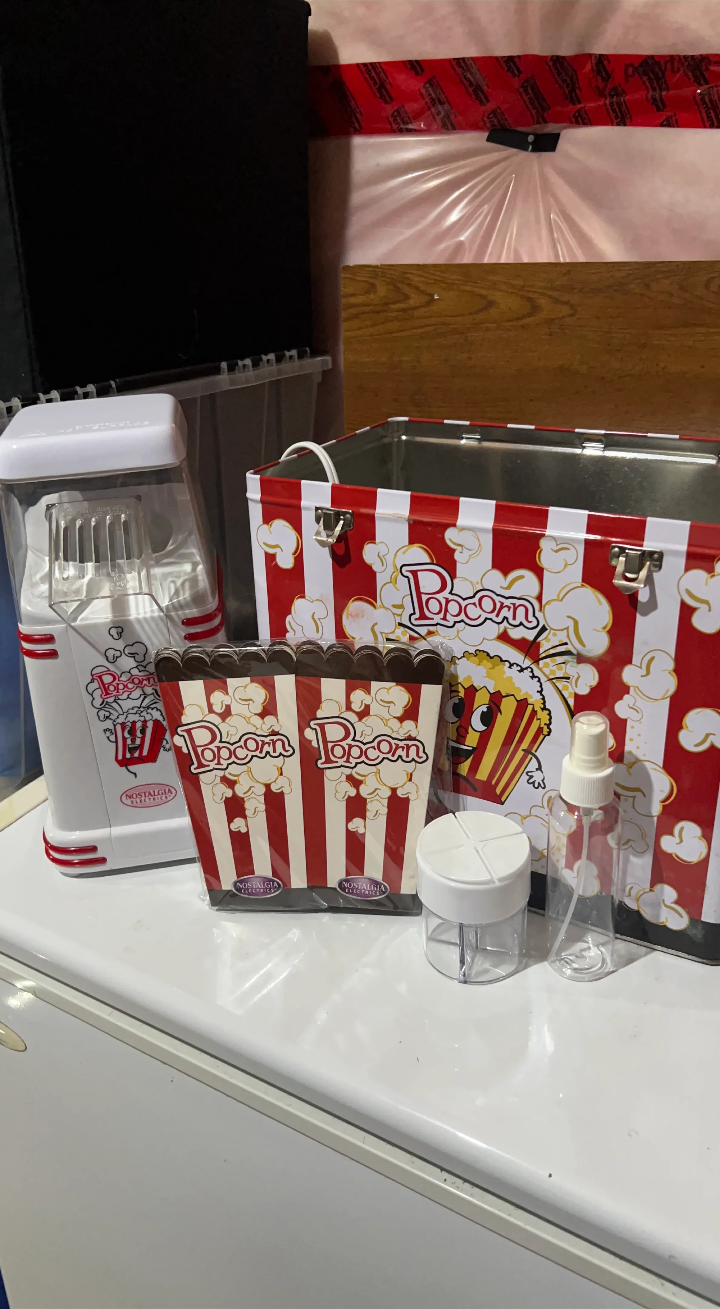 Get ready for movie night with this fun popcorn maker set from Nostalgia Electrics! This set includes the popcorn maker itself, a popcorn container, a tin, and some smaller containers. Perfect for making delicious popcorn at home!