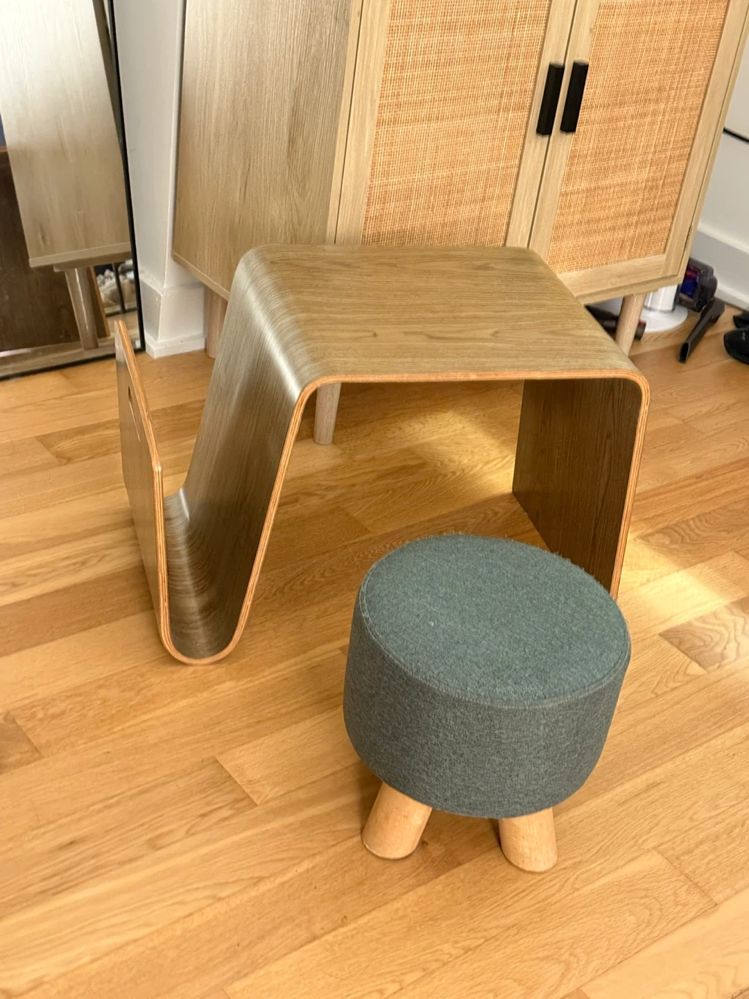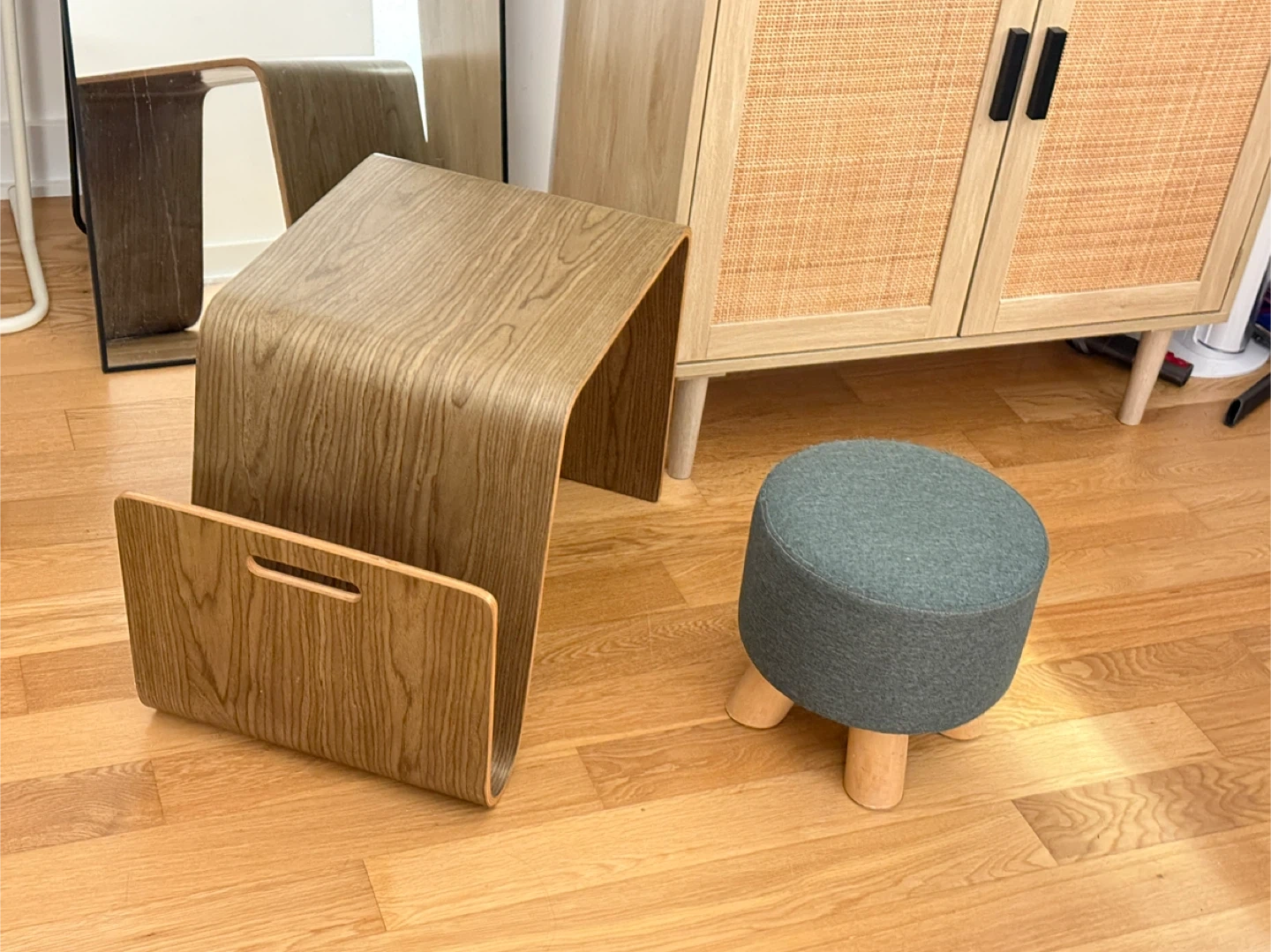 Selling a cute magazine rack and a small gray ottoman! They're both in great condition and would be a lovely addition to any room