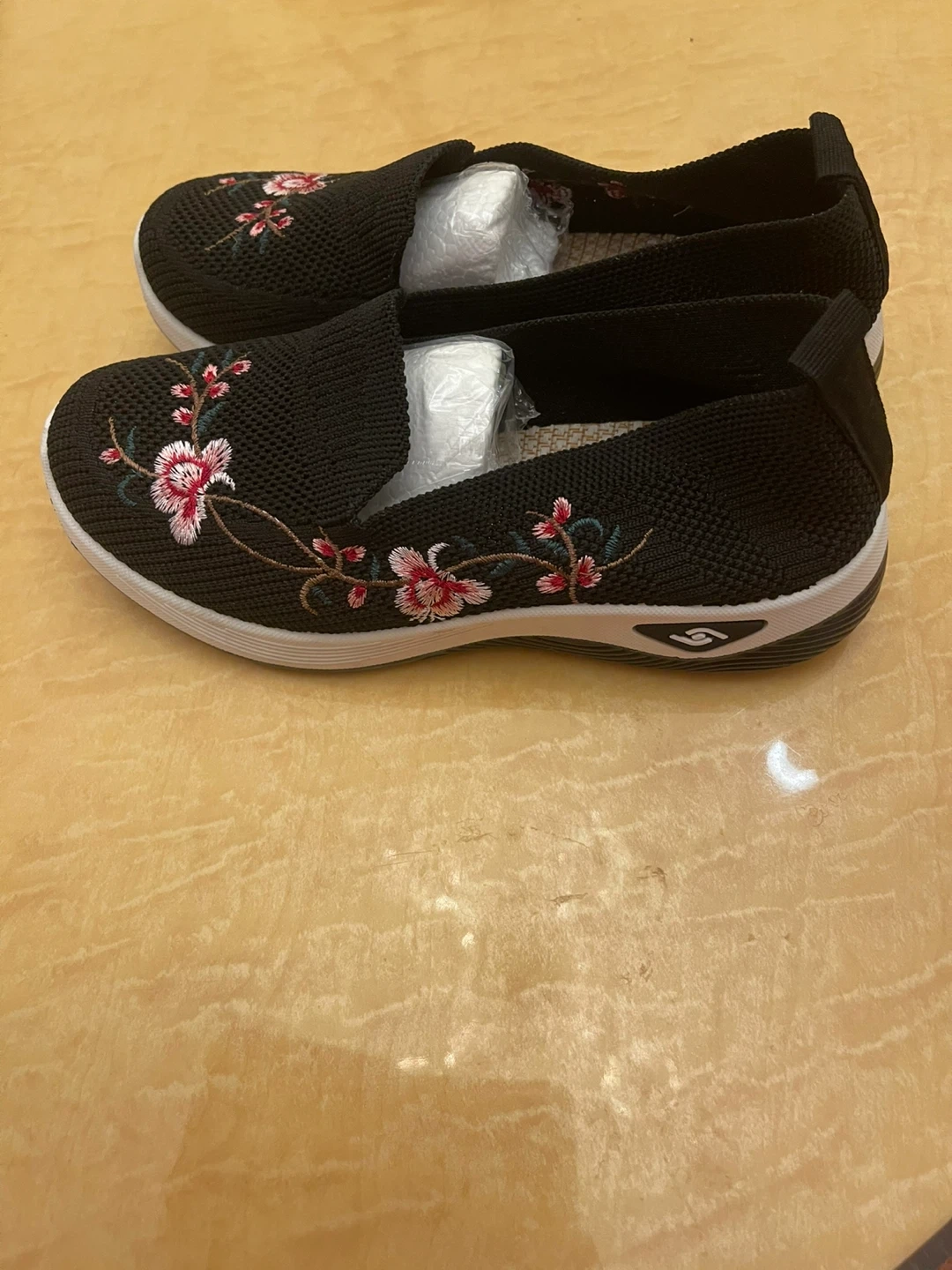 33These are a cute pair of black slip-on shoes with floral embroidery. They're in great condition and ready for a new home! The shoes have a comfortable, casual style perfect for everyday wear. Size 6. Price $15 negotiable