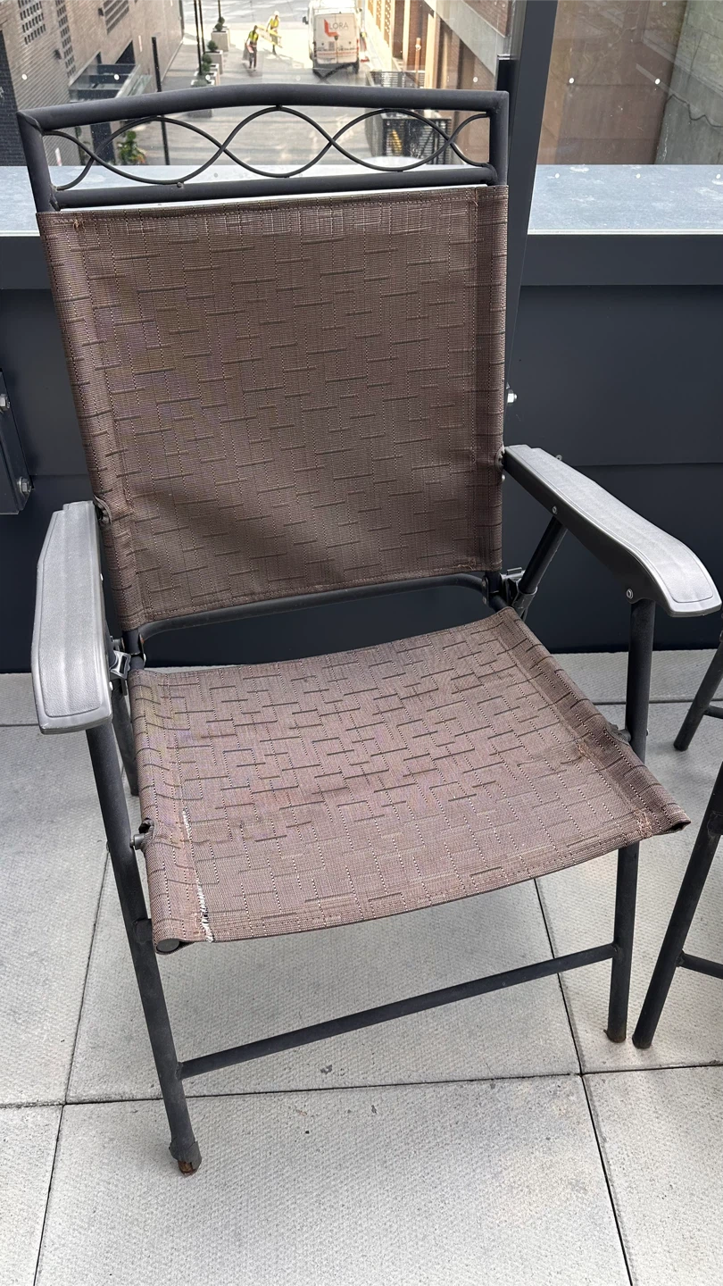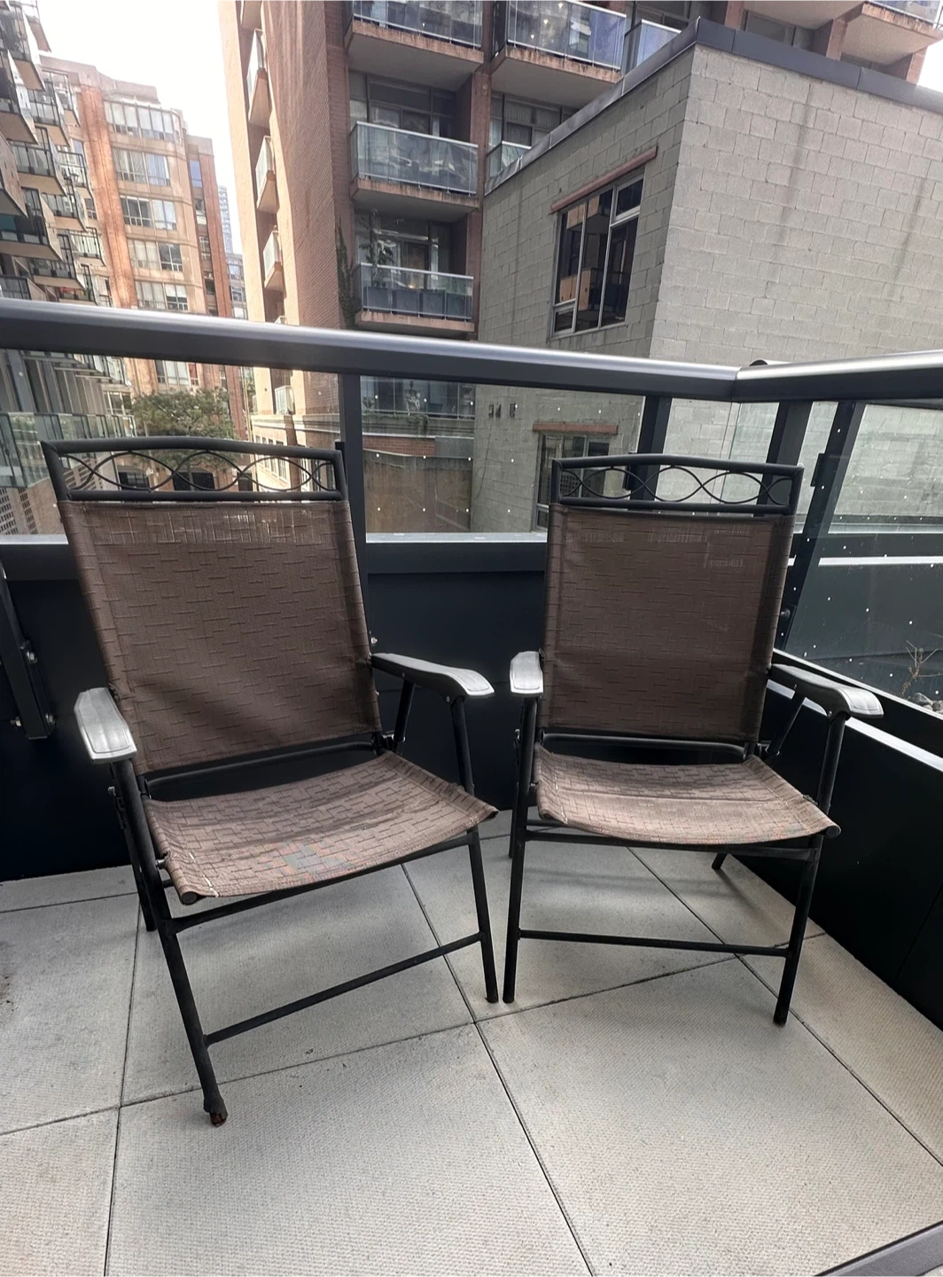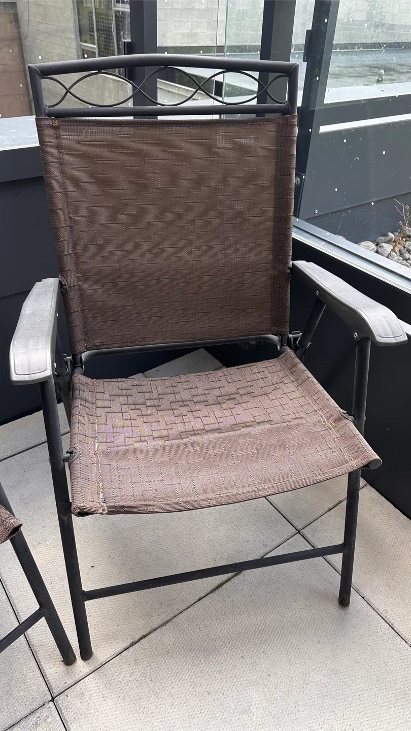 Set of two folding patio dining chairs in fair condition. Great for the backyard, deck, or even camping.