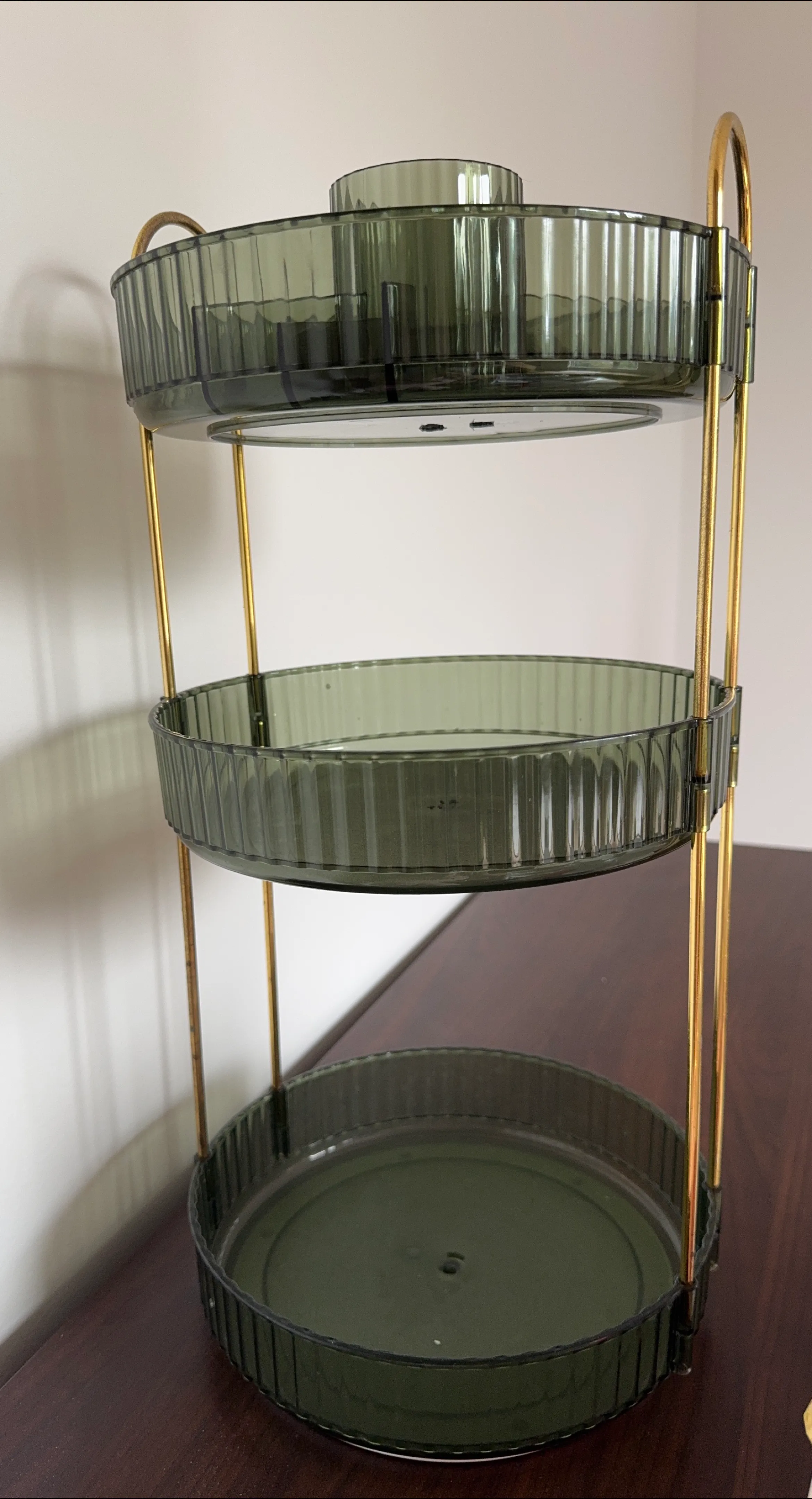 Here's a stylish 3-tier organizer! It features a sleek green colour with gold accents. Perfect for adding a touch of modern elegance to any room and keeping your items neatly organized