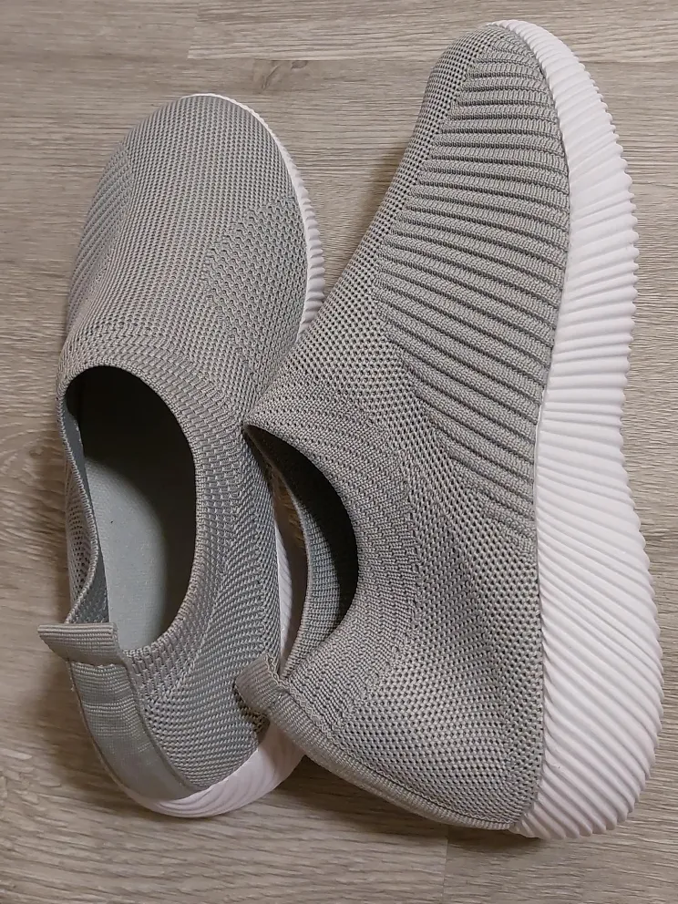 Selling a pair of grey slip-on shoes in size 37. They're in great condition and super comfy for everyday wear! The soles are white and have a cool, textured design. it's 37 EU size which would be 6.5-7