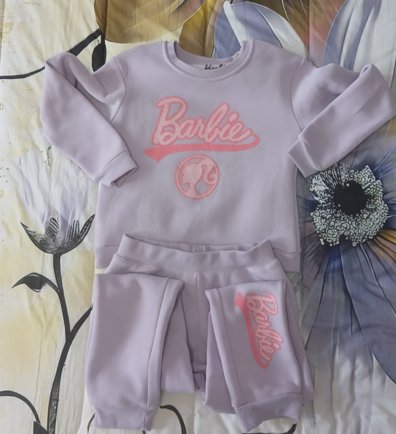 Selling a super cute Barbie branded sweat suit for kids! It's a lovely lavender colour with the Barbie logo in pink. Perfect for keeping your little one comfy and stylish