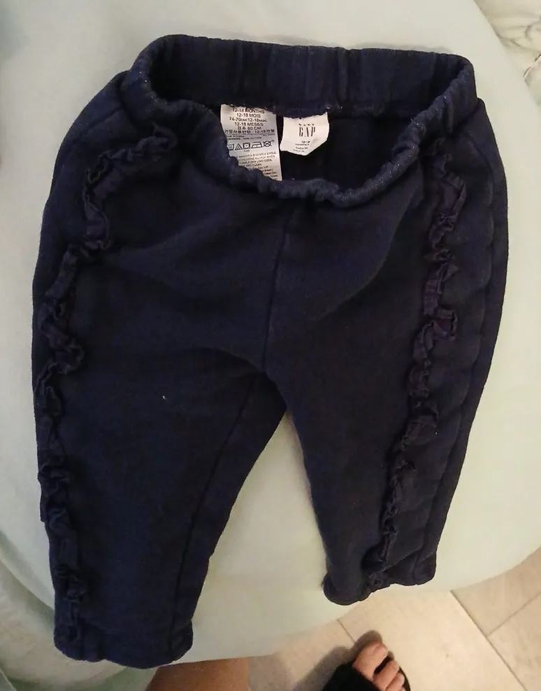 Cute pair of Gap baby girl pants in size 12-18 months! They're a dark blue colour and have a cute ruffle detail on the sides