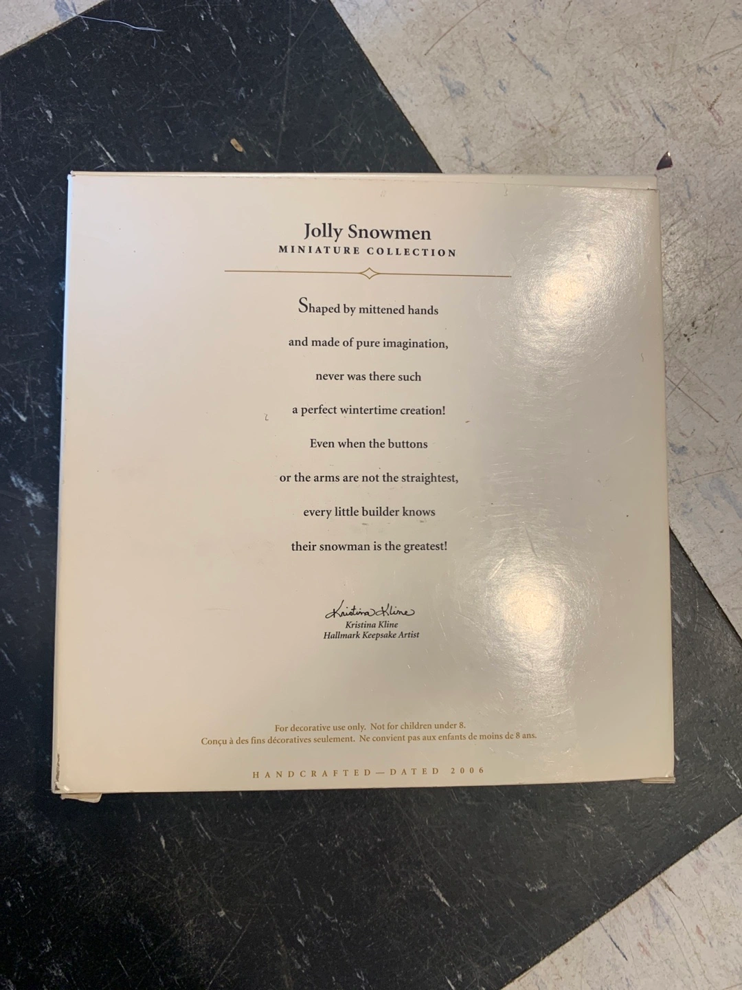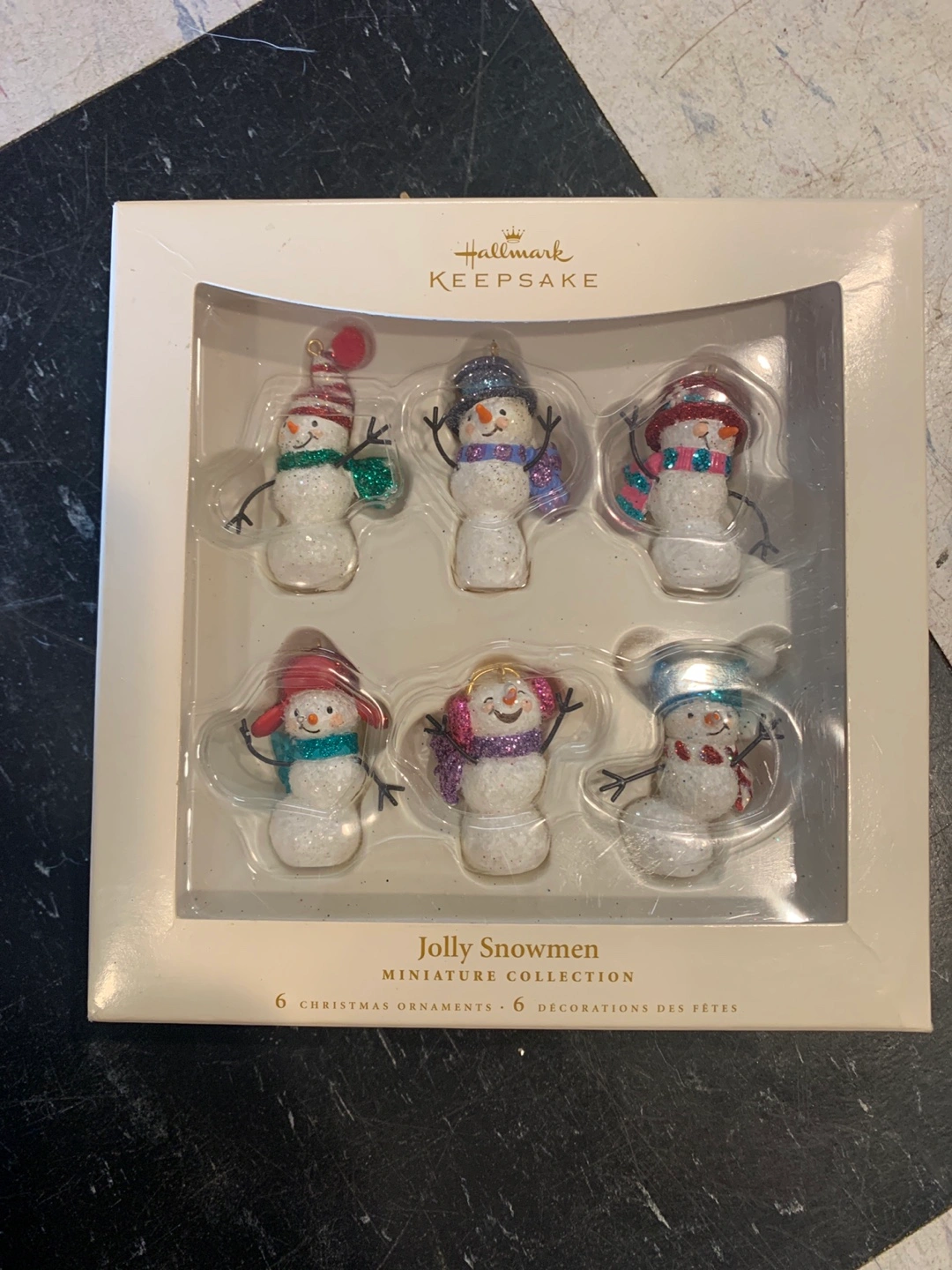 15Selling a set of Hallmark Keepsake 'Jolly Snowmen' miniature Christmas ornaments. The set includes 6 handcrafted ornaments, shaped by mitted hands and made of pure imagination. Dated 2006, these are a perfect wintertime creation! They come in the original box