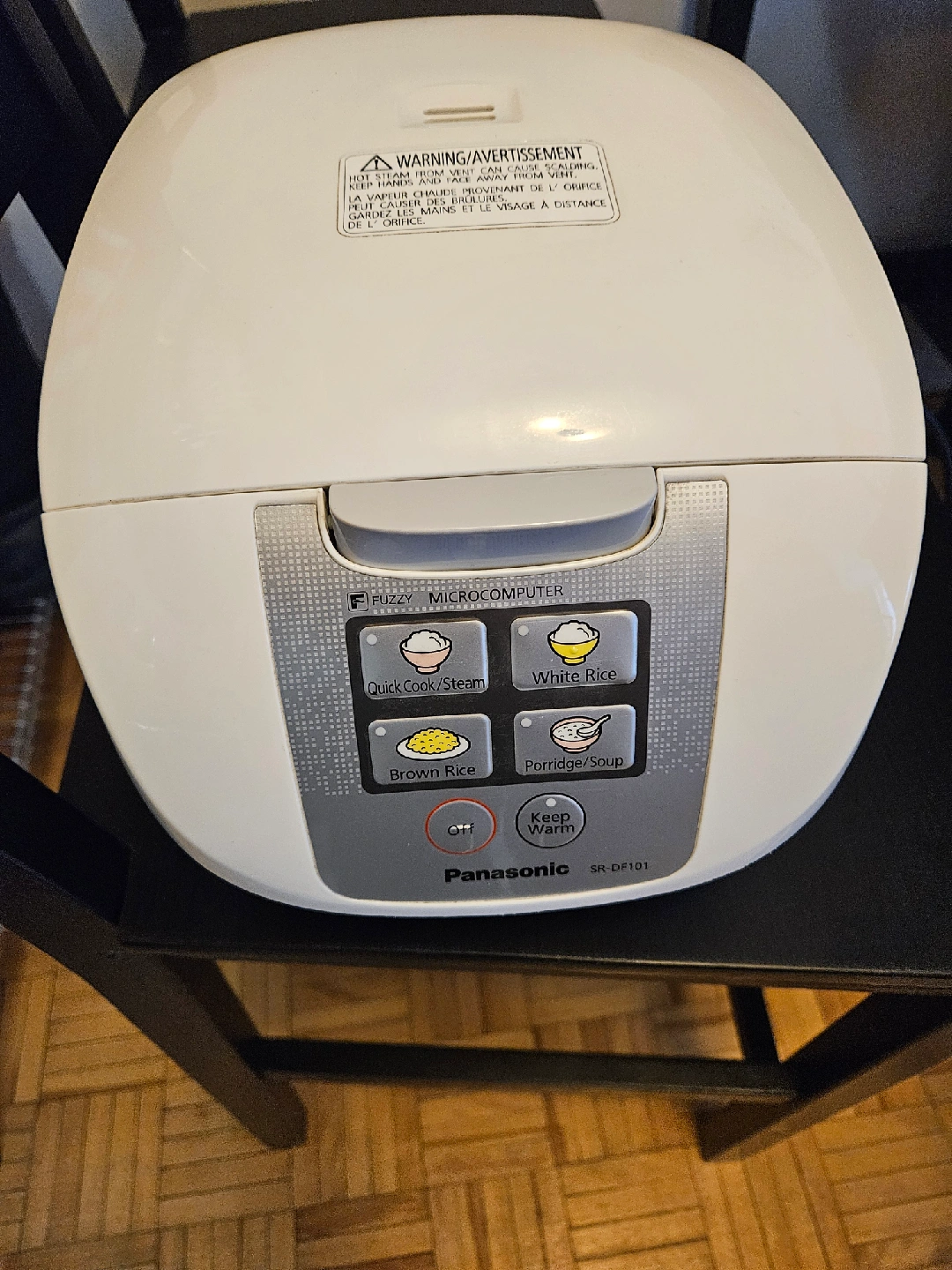 Pick up only. Selling a Panasonic SR-DF101 Fuzzy Microcomputer rice cooker. It's in good condition with a some markings in the bowl but still works great for cooking rice. It has settings for quick cook/steam, white rice, brown rice, and porridge/soup. Plus, it has a keep warm function.