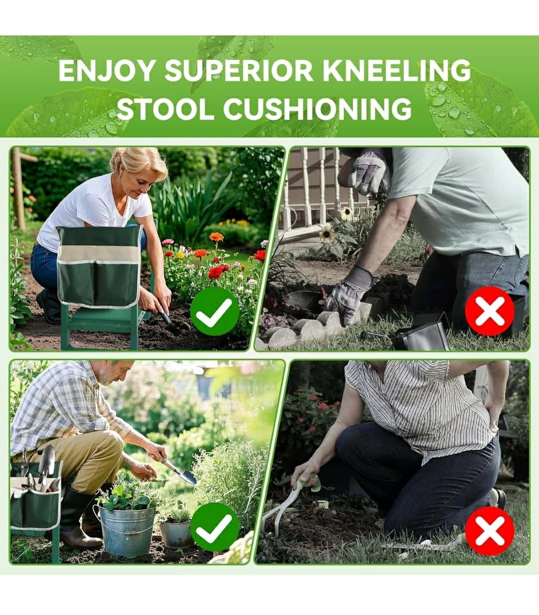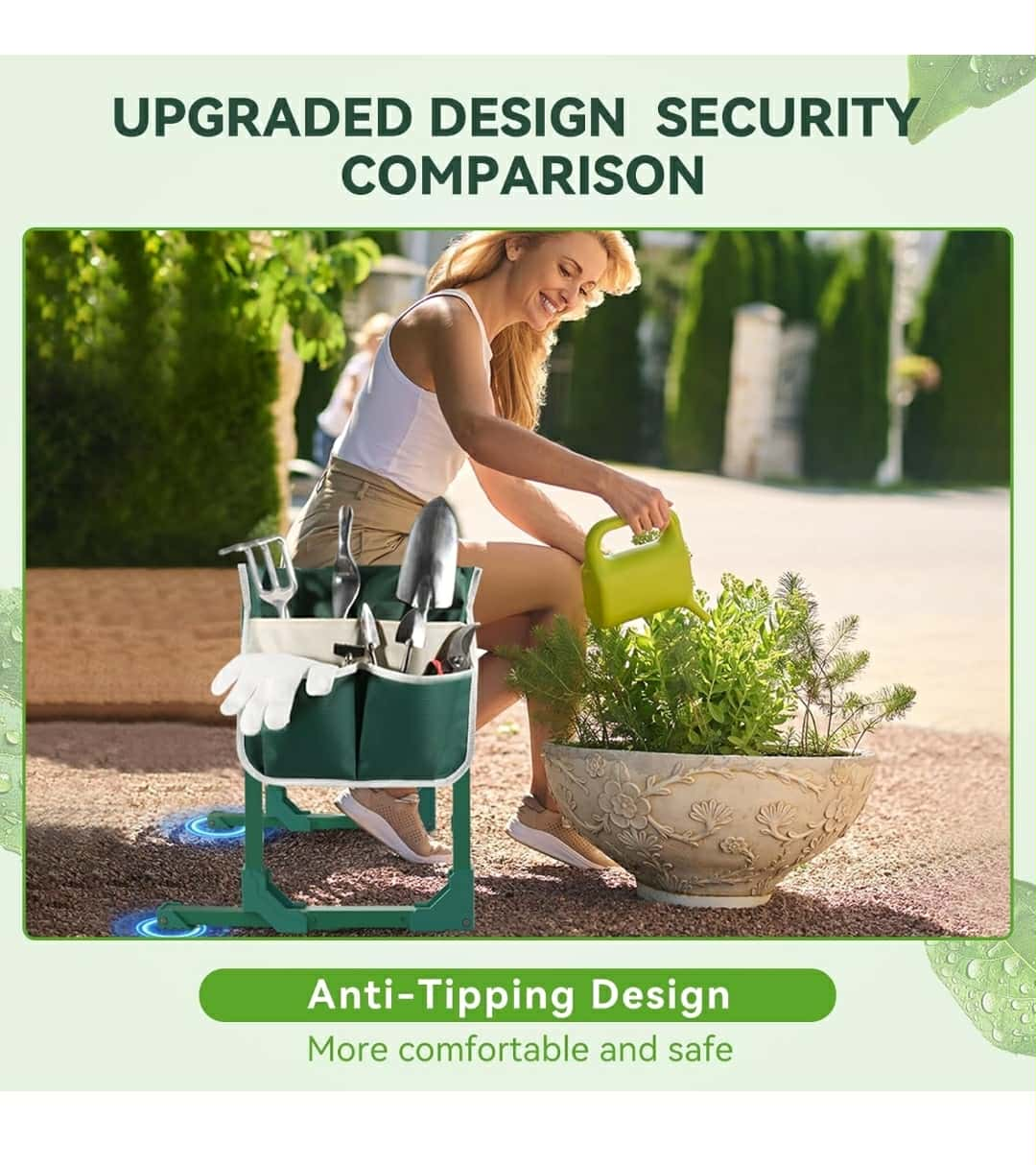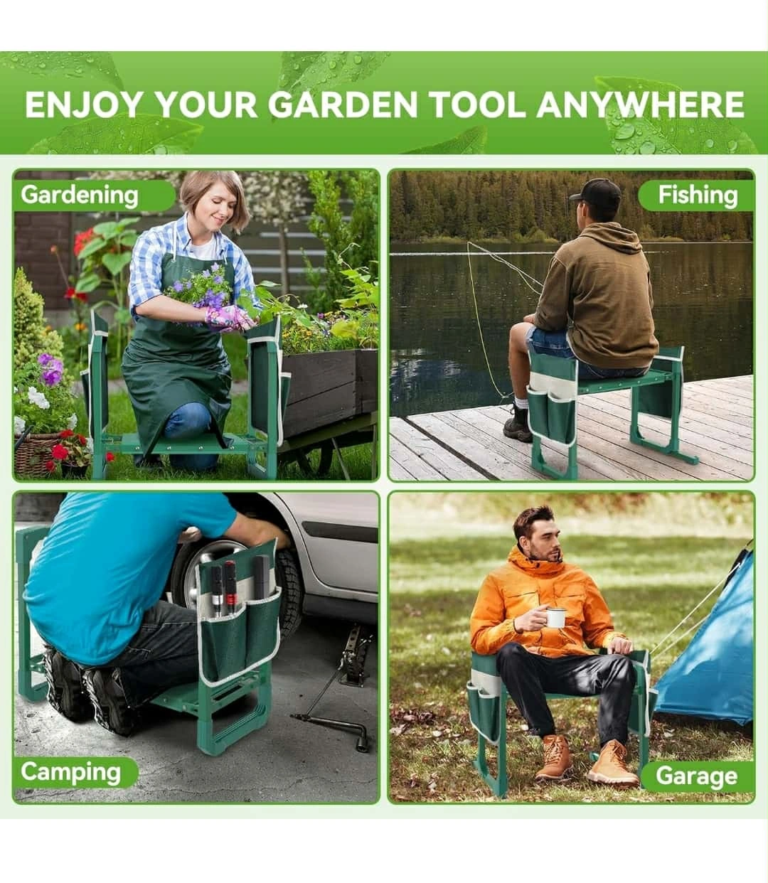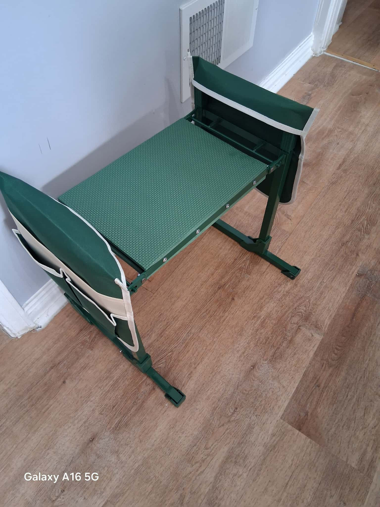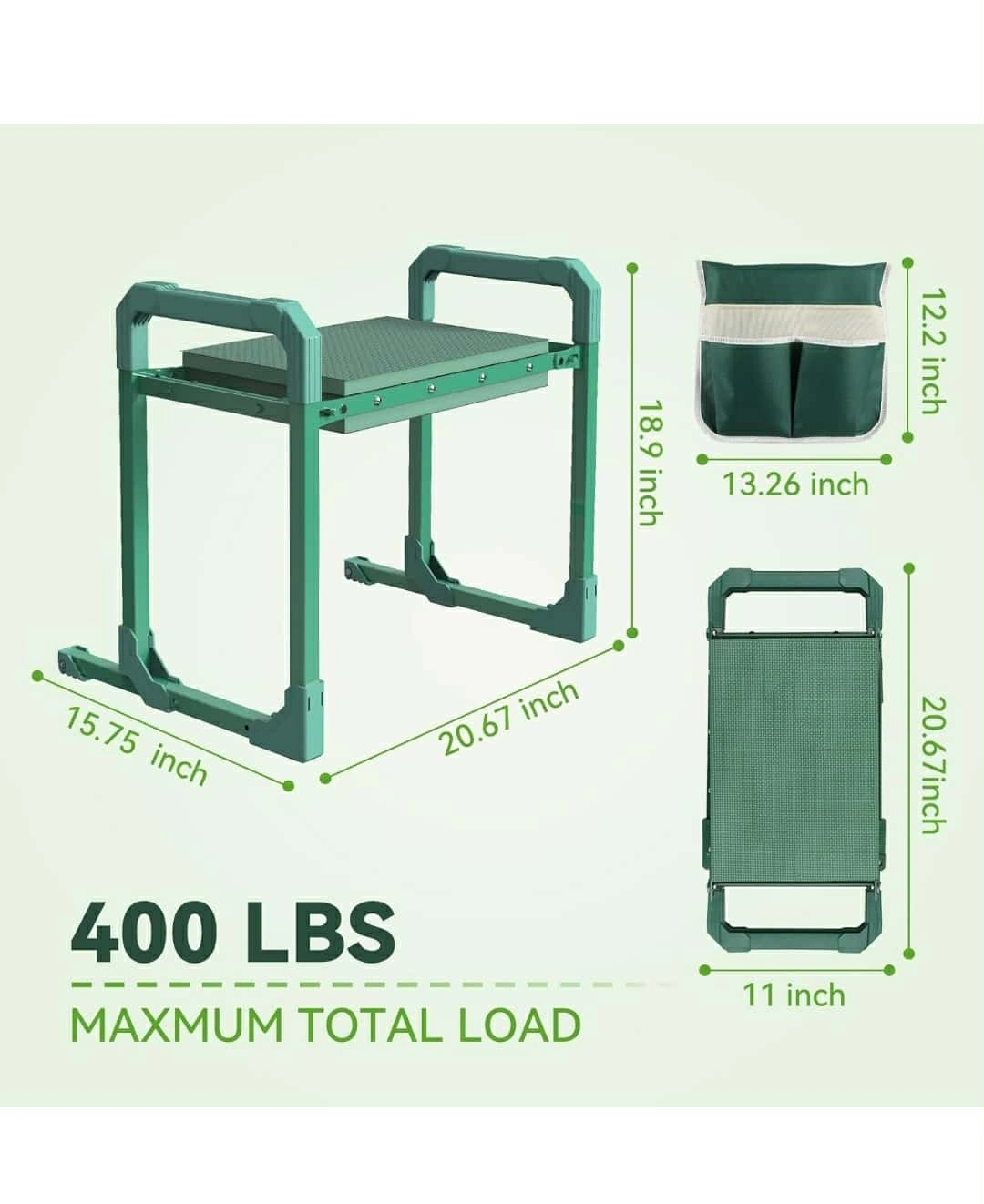 This garden kneeler seat is perfect for gardening, fishing, camping, or garage work! It features an upgraded design for security and is anti-tipping for more comfort and safety. It can also be used as a stool. The dimensions are approximately 18.9 inches in height, 15.75 inches in width, and 20.67 inches in depth. It also comes with a tool pouch!