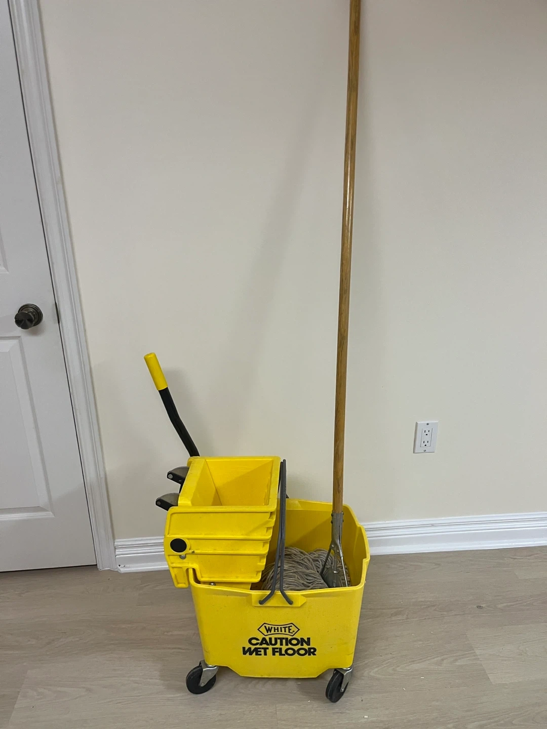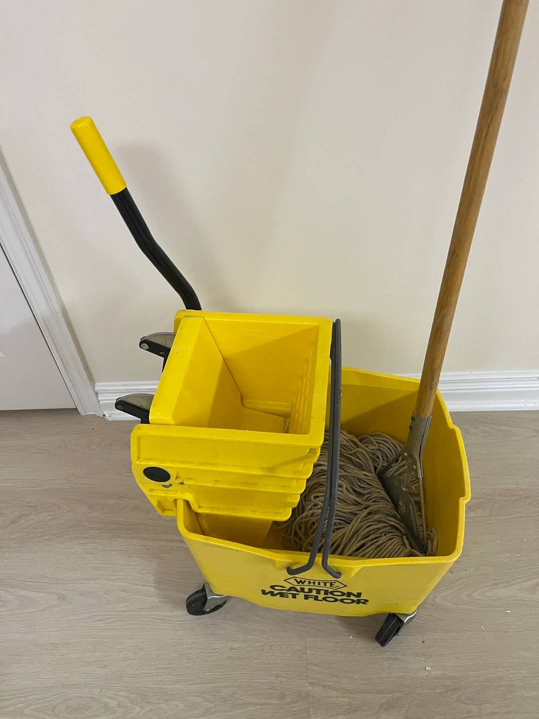 Selling a caution wet floor mop bucket. It's in great condition and ready to use for all your cleaning needs!