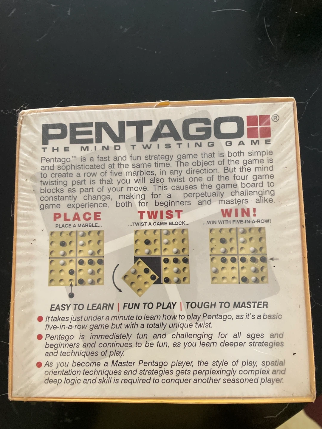 Selling a brand new, still-in-box Pentago game! It's a fun and fast strategy game that's easy to learn but takes a lifetime to master! Suitable for ages 6 and up, it's perfect for beginners and masters alike! The game features a unique twist where you twist game blocks as part of your move, constantly changing the game board