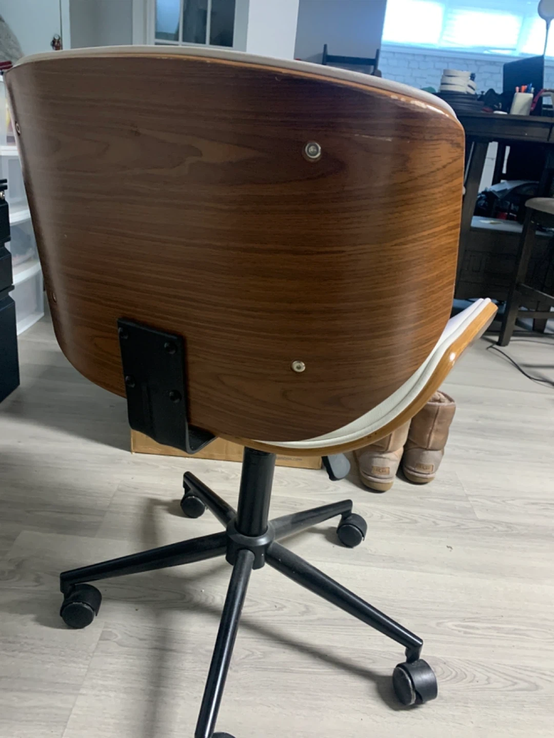 Here's a stylish office chair with a wood-grain back and white leather seat. It has a modern look and would be great for a home office or study space. The chair features a sturdy base with smooth-rolling wheels for easy movement. Ergonomic and super comfortable. Original price $300!