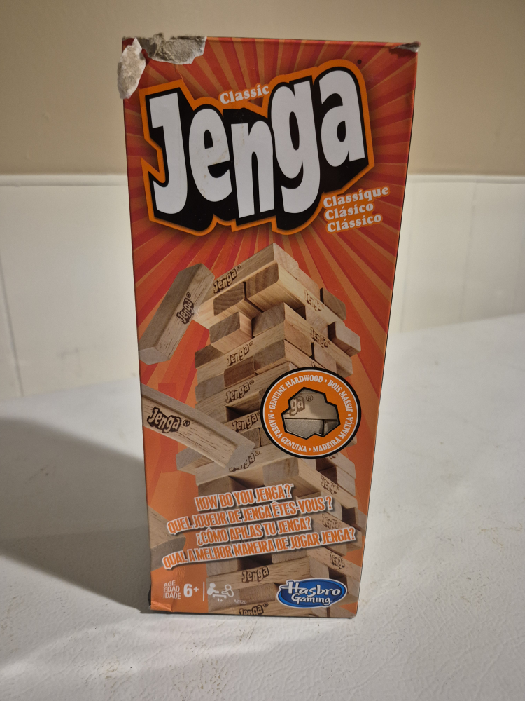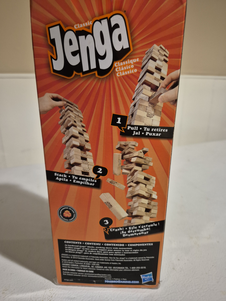 Selling a classic Jenga game by Hasbro! It's a fun game for ages 6 and up. The box includes Jenga blocks and a stacking sleeve with instructions. Get ready for some tower-tumbling fun