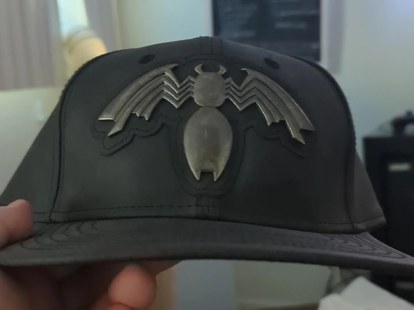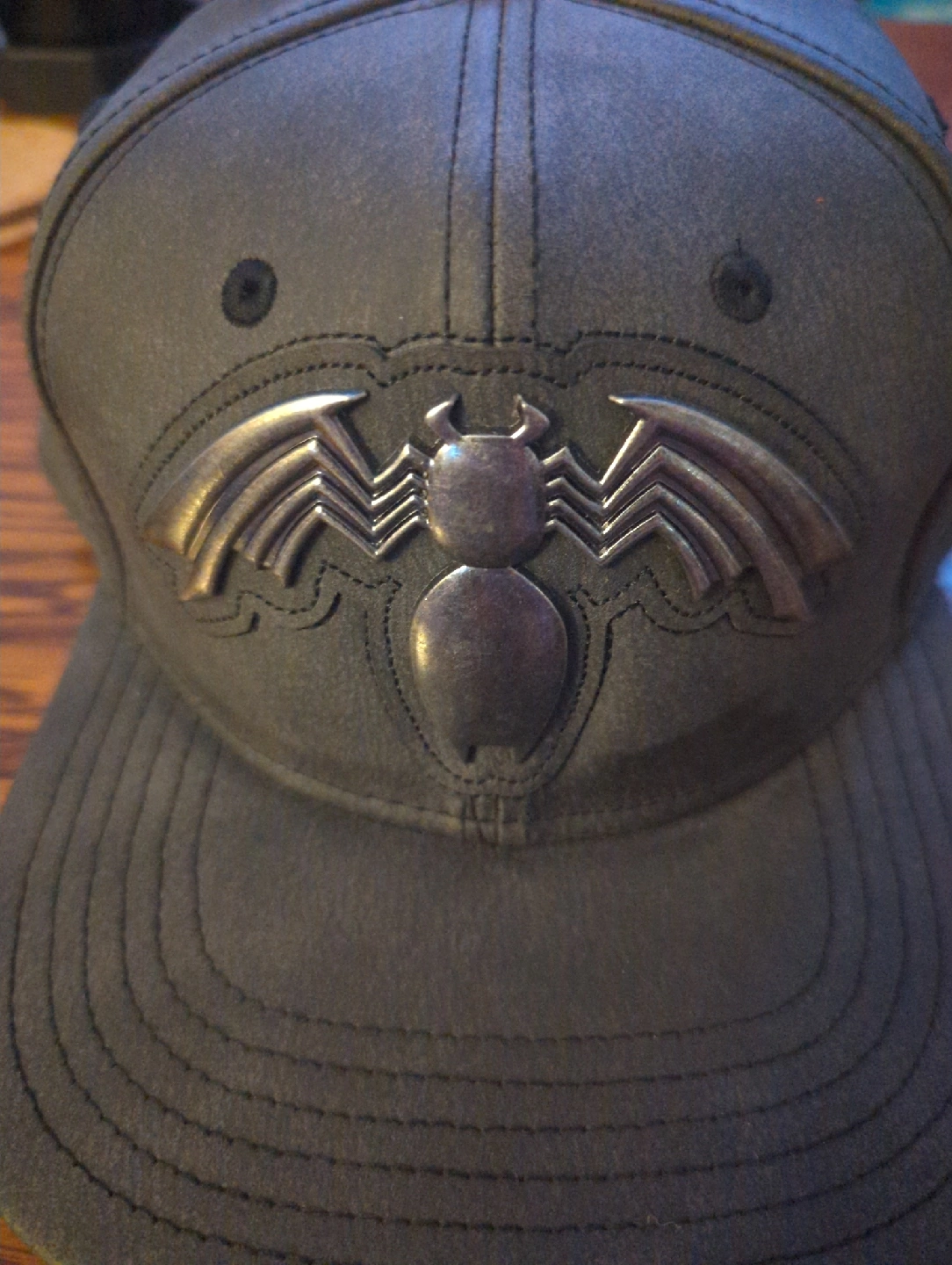 Selling a Pleather Snapback with a Metallic Venom Spider logo as shown in the pictures. the hat itself is a greyish pleather material.