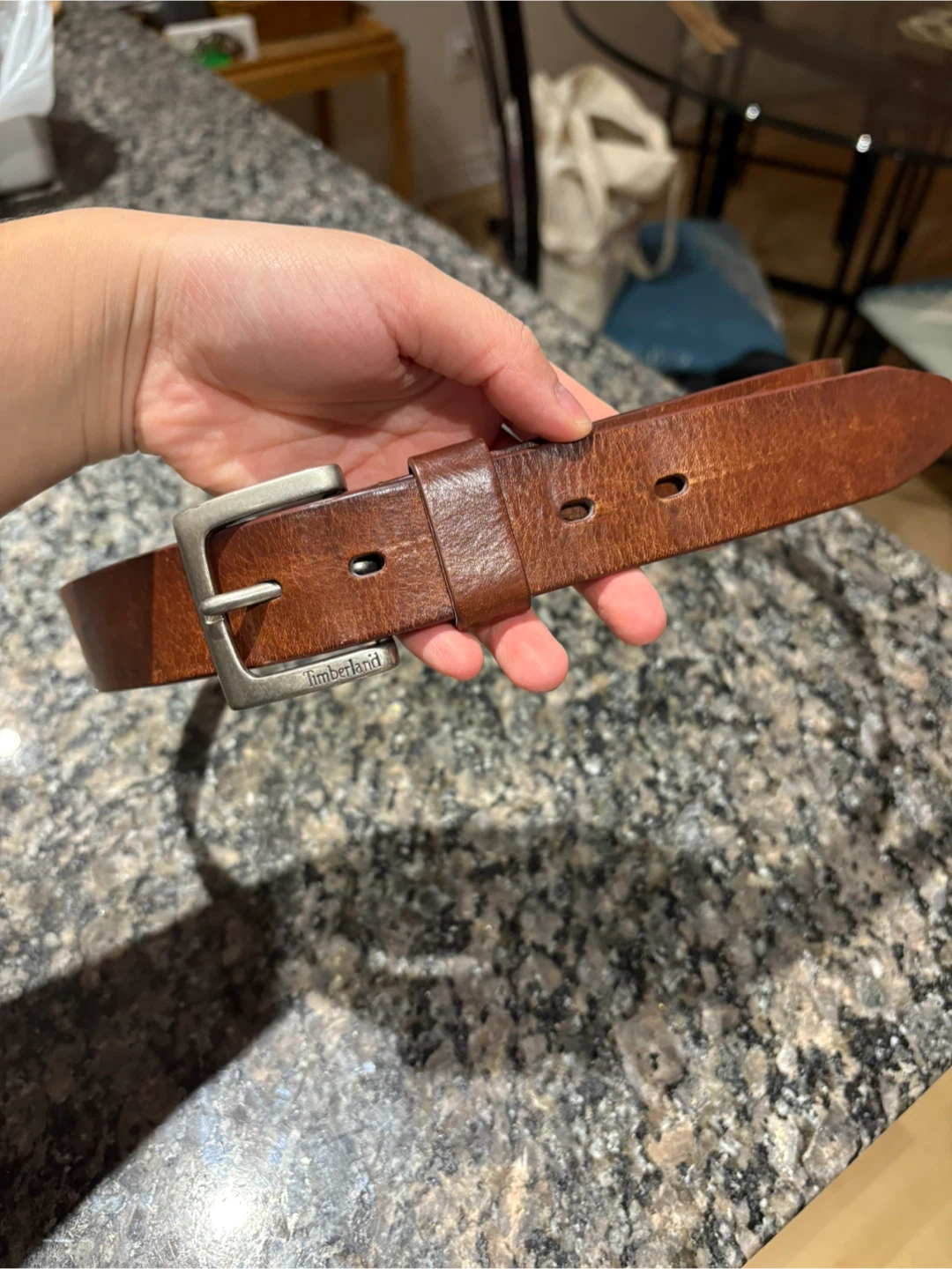 Lightly worn Timberland brown leather belt in good condition. It has a silver-tone buckle and classic design.