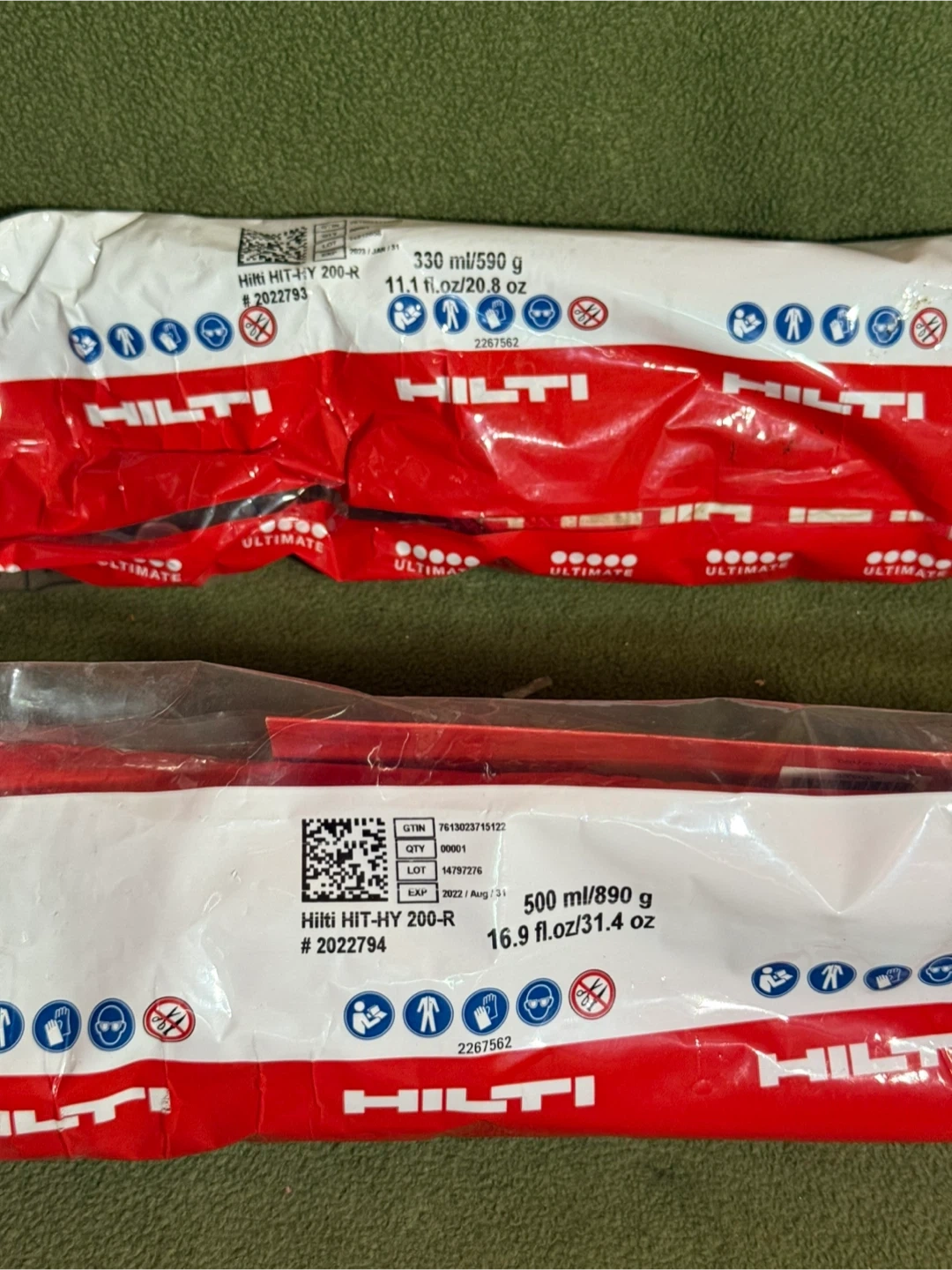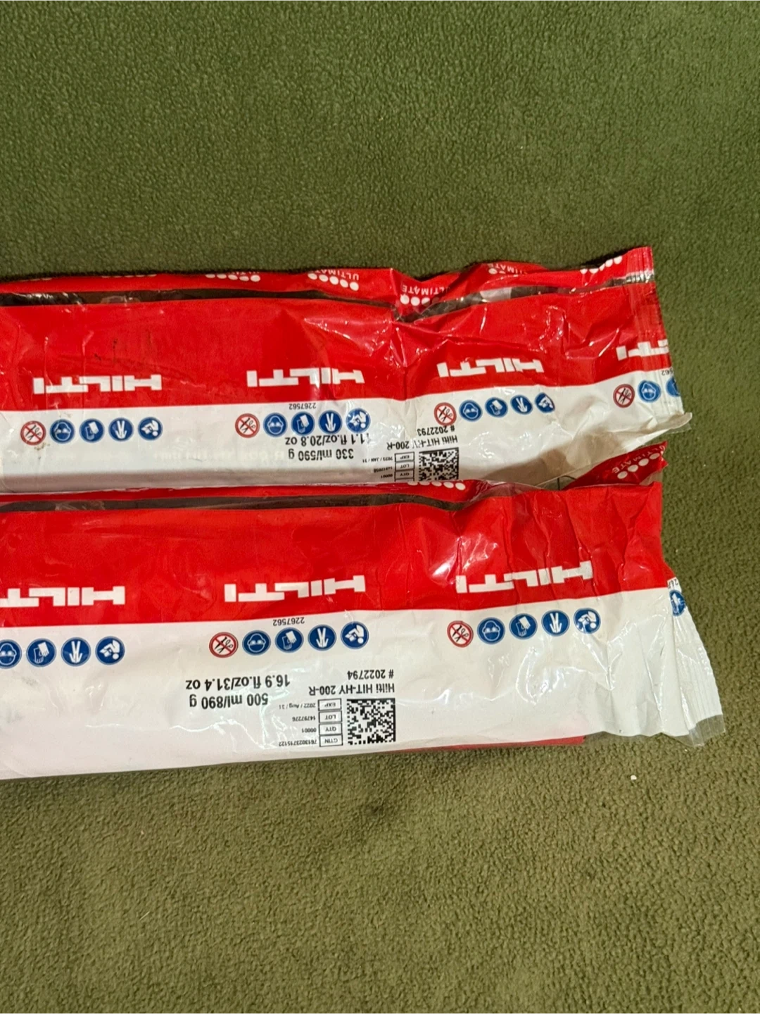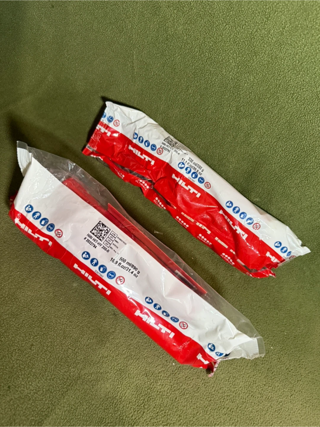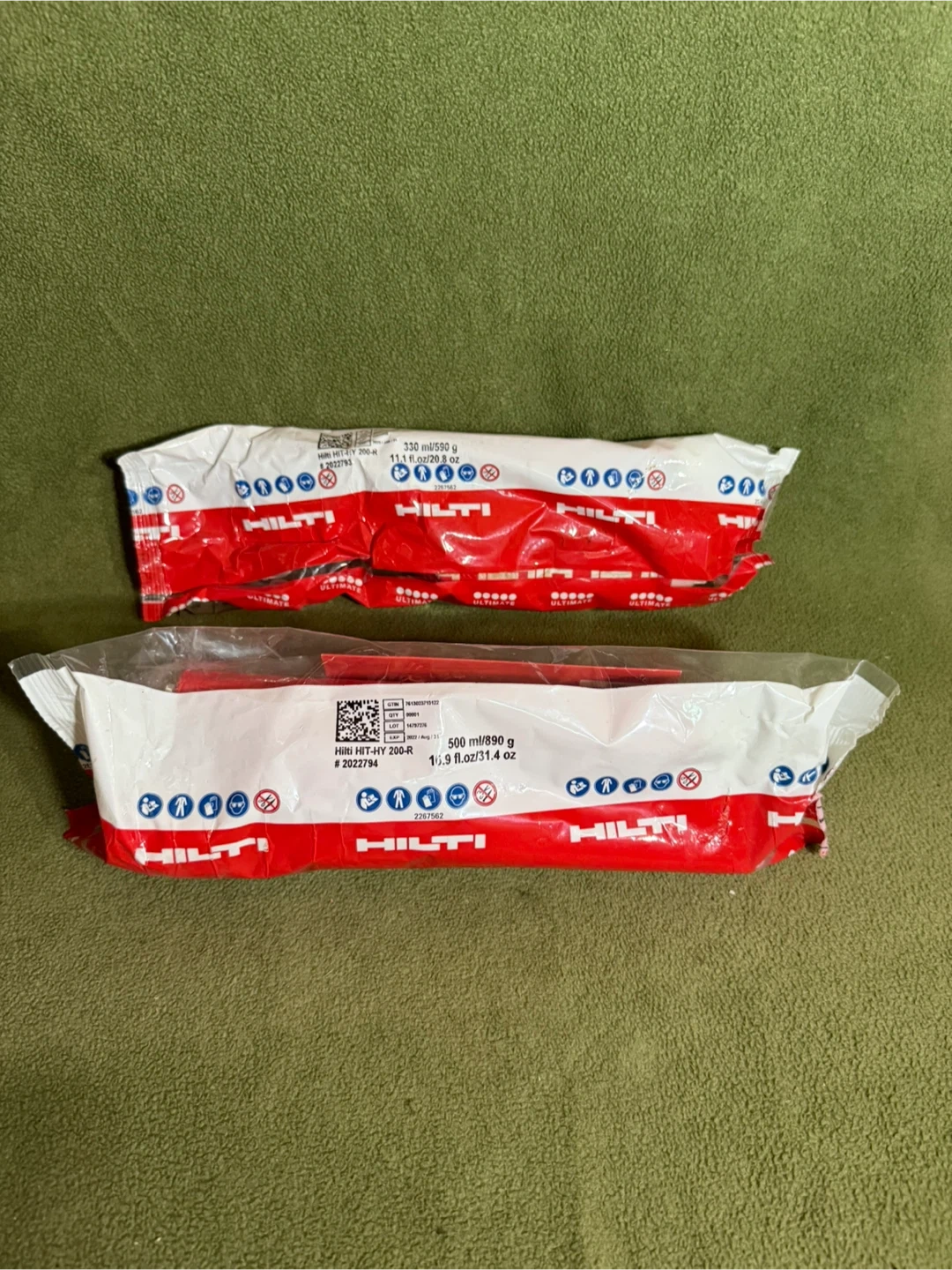I am selling two new and sealed packages of Hilti HIT-HY 200-R concrete epoxy. One is 330ml/590g and the other is 500ml/890g, perfect for anchoring and bonding in concrete. These are high-quality, unopened, and ready for your construction needs.