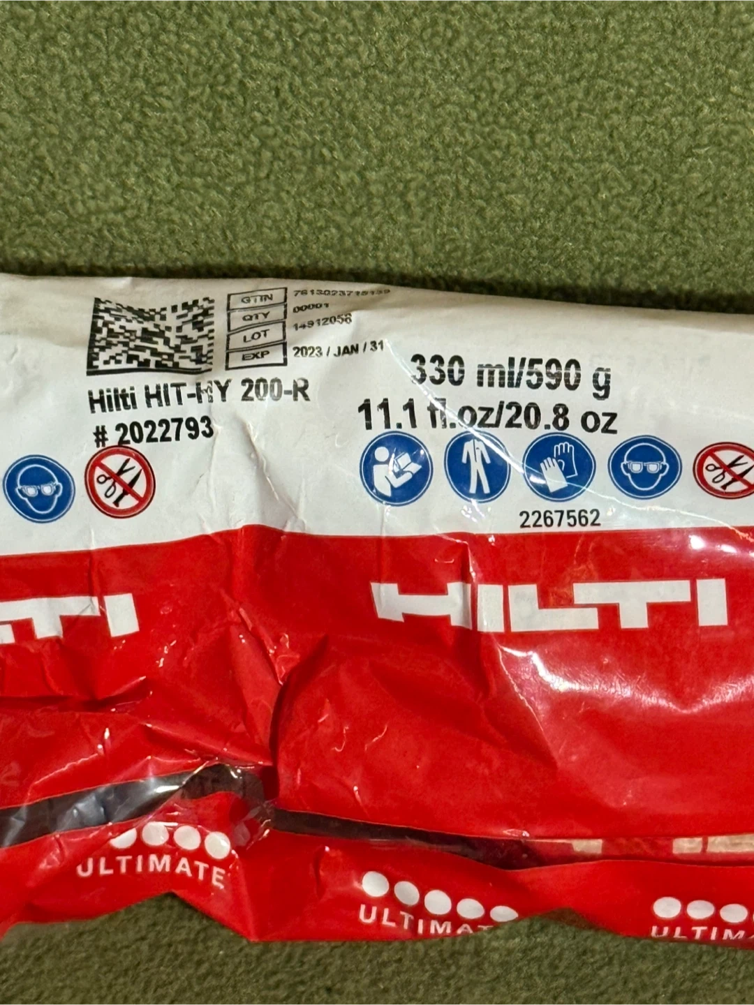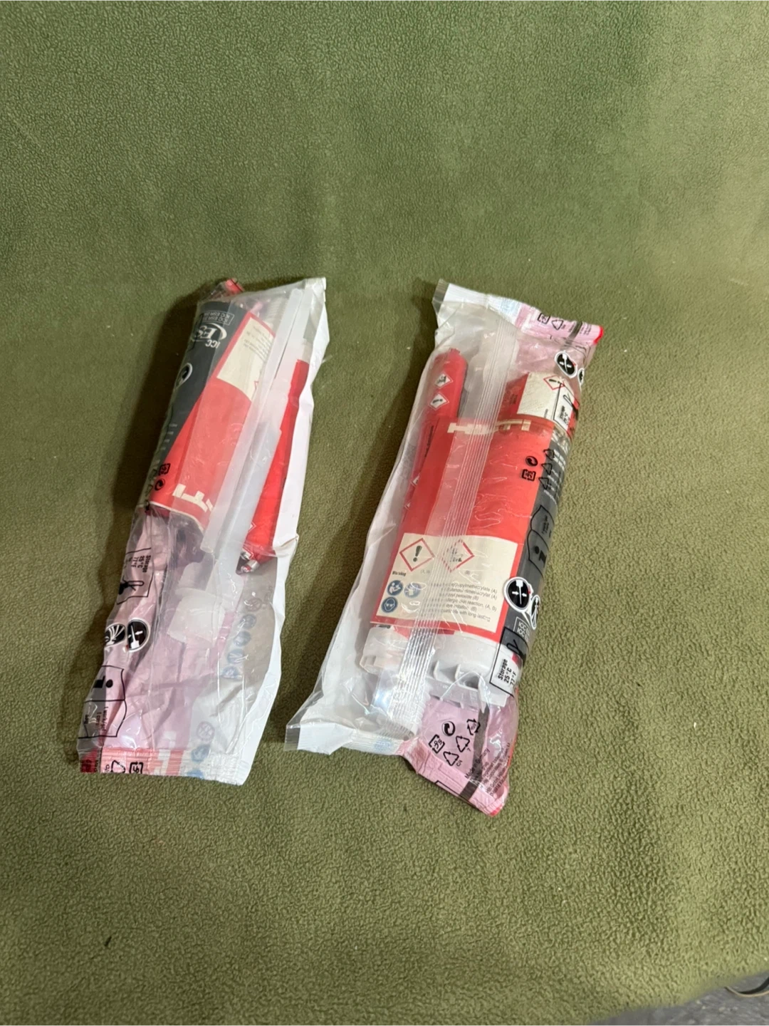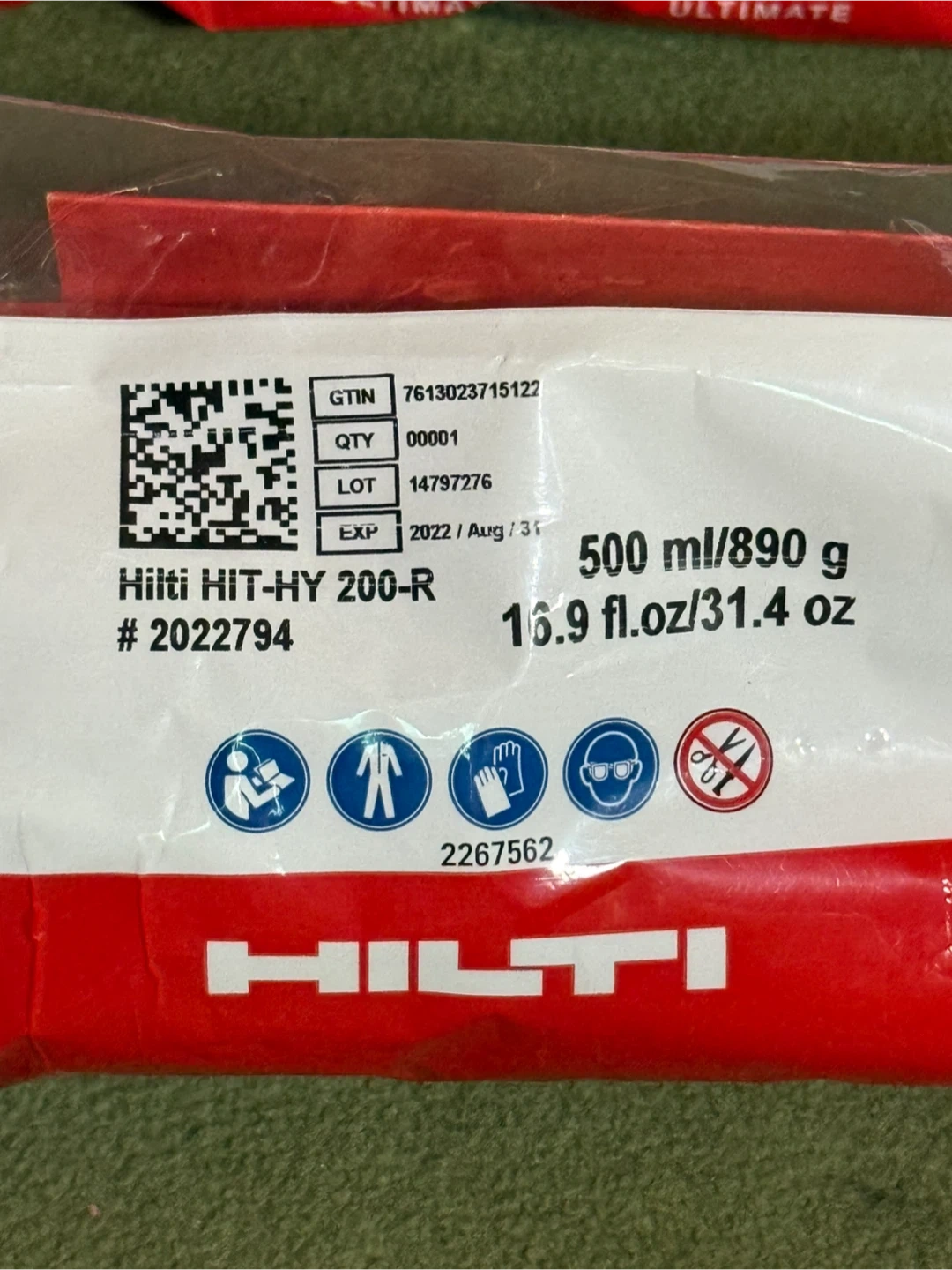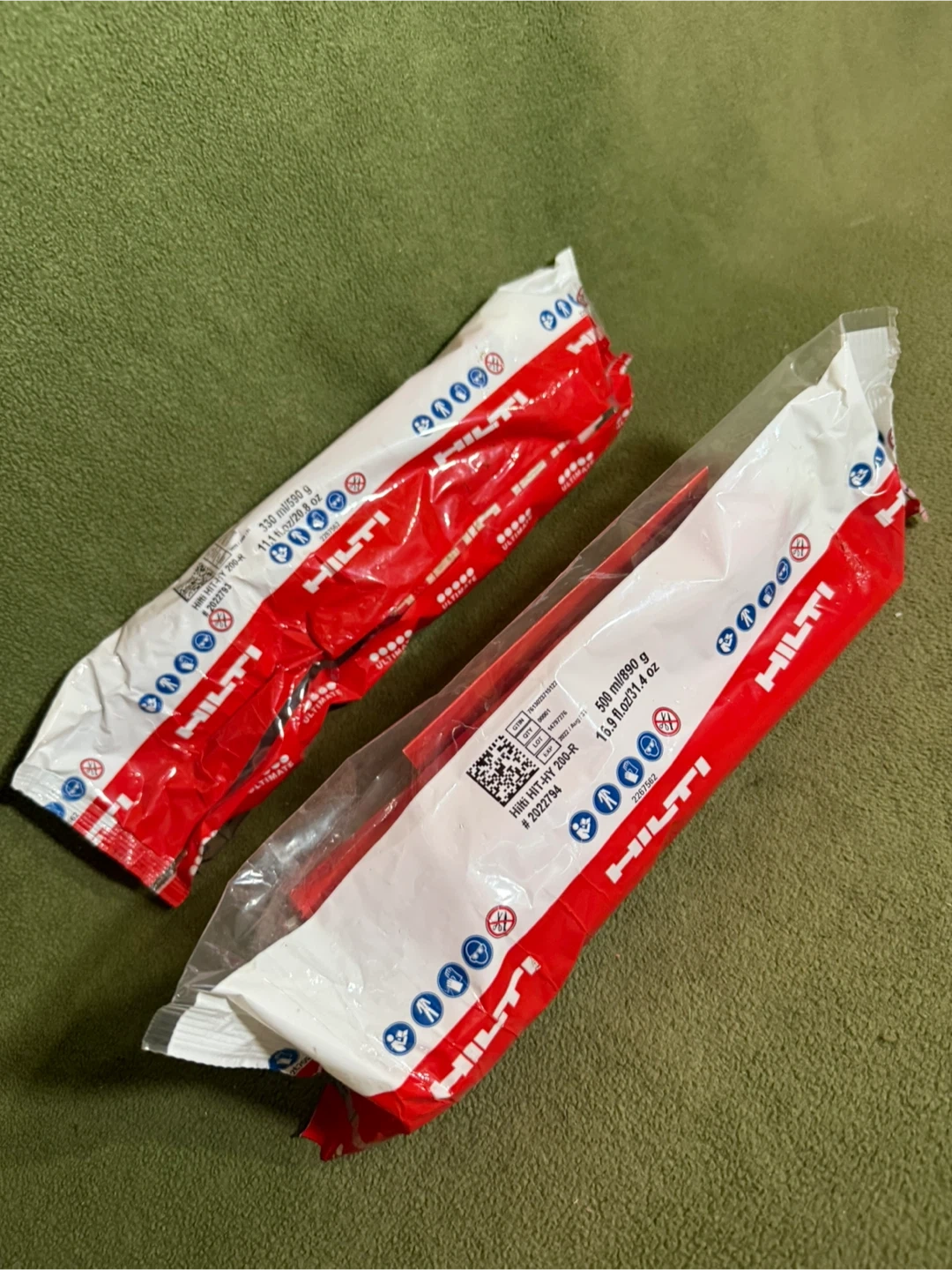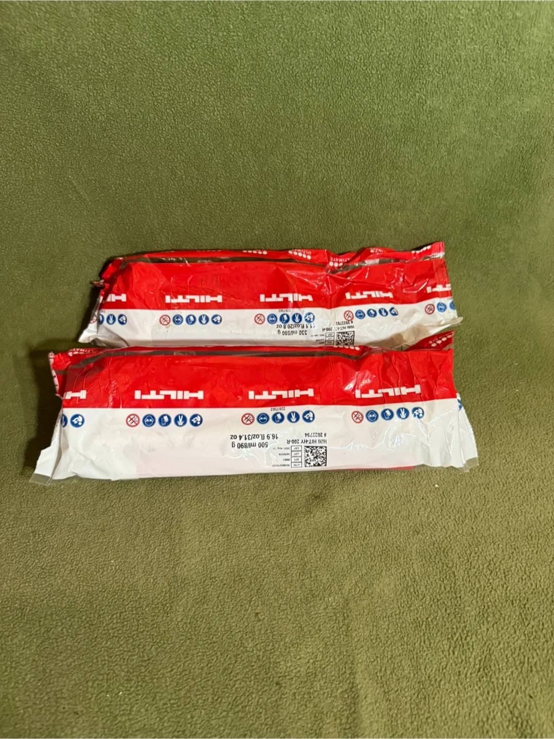 I am selling two new and sealed packages of Hilti HIT-HY 200-R concrete epoxy. One is 330ml/590g and the other is 500ml/890g, perfect for anchoring and bonding in concrete. These are high-quality, unopened, and ready for your construction needs.