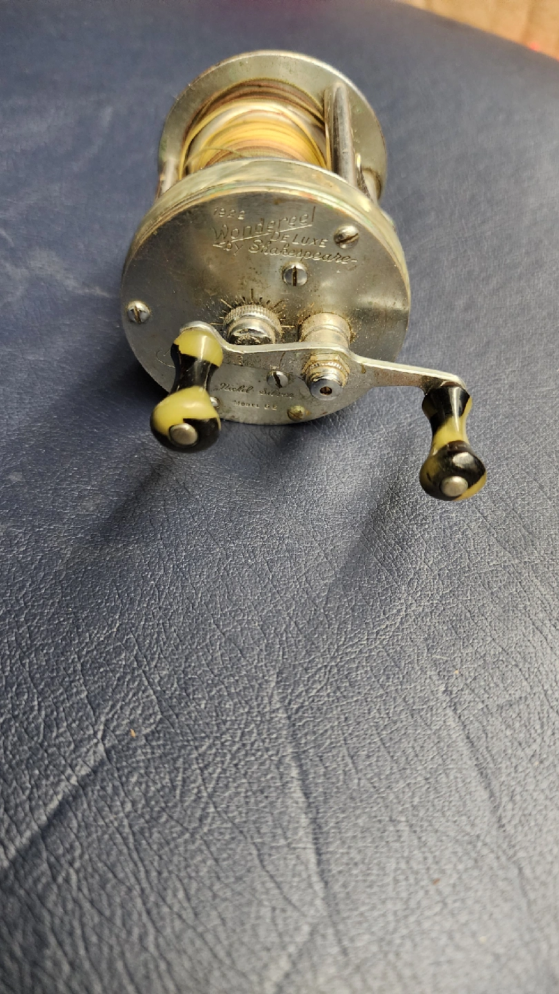 Selling a vintage Shakespeare Wondereel fishing reel, Model GC, made in Canada by Inglis. It's a classic piece for any fishing enthusiast or collector! It shows some signs of wear consistent with its age, but it's still a cool piece of history