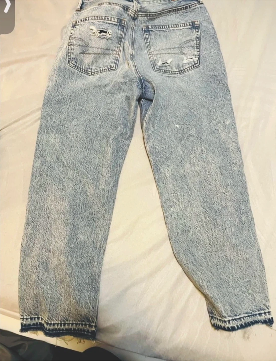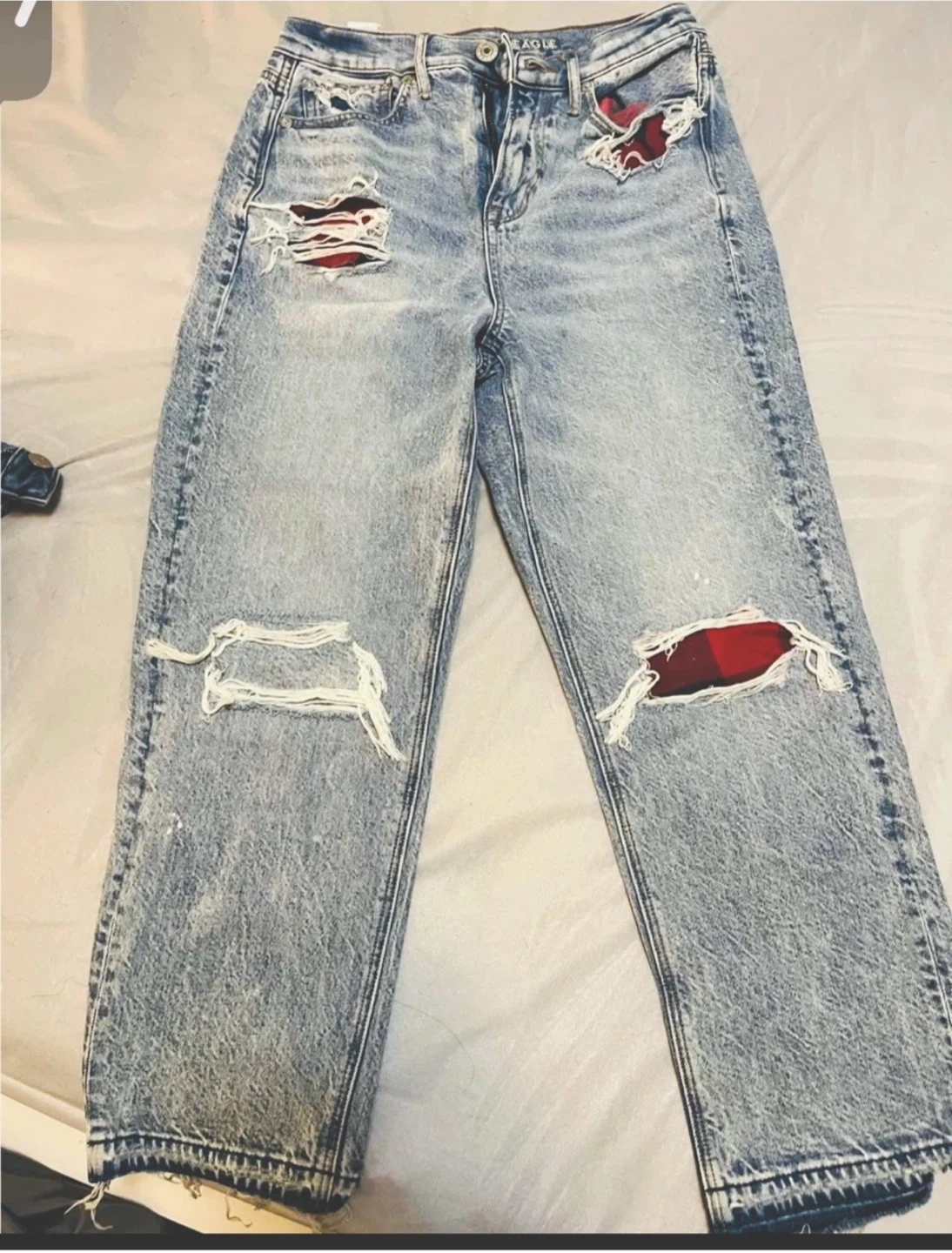 Selling a pair of American Eagle mom jeans in a distressed style! They are light wash denim with rips and repairs. Great for a casual look