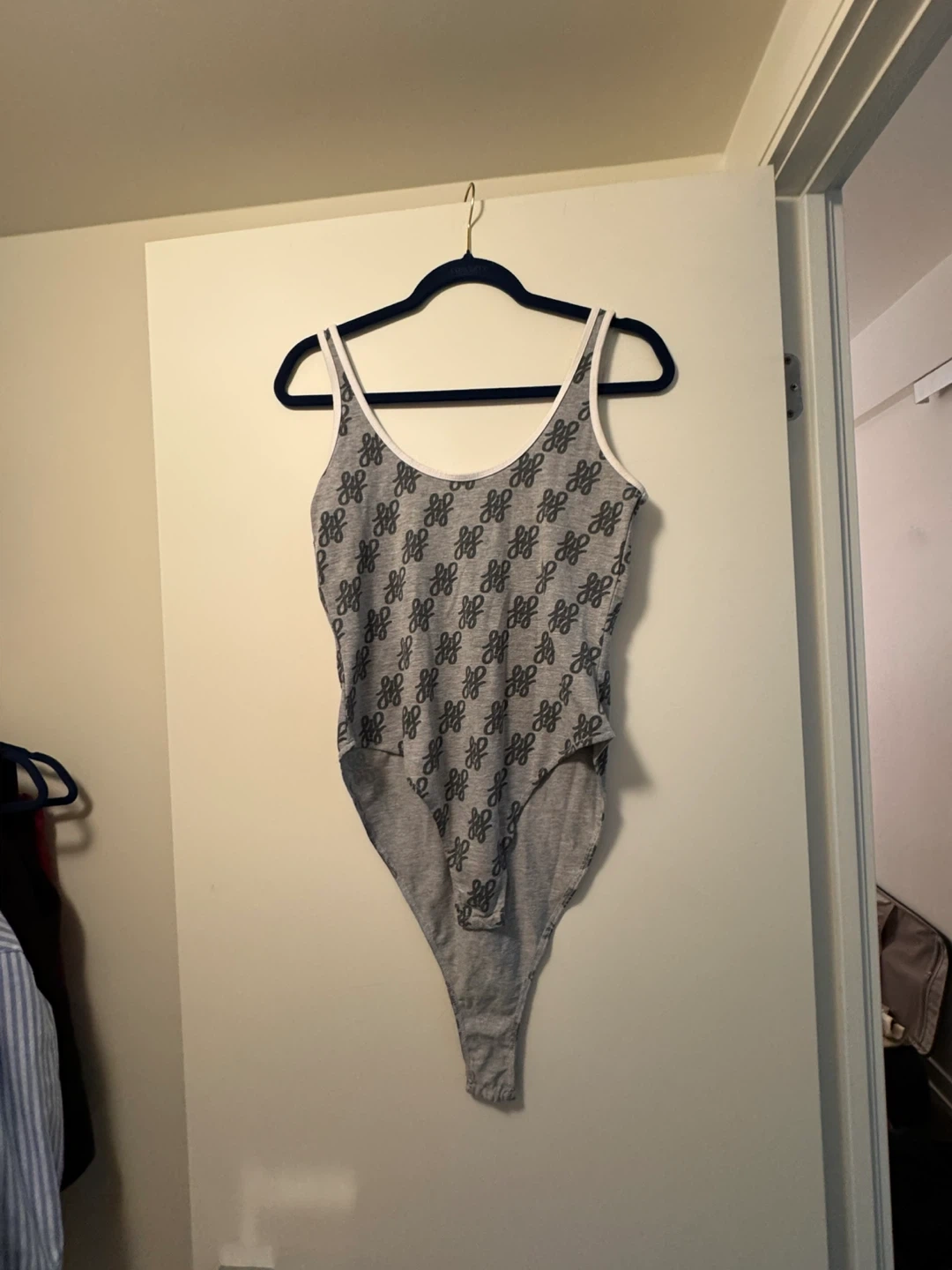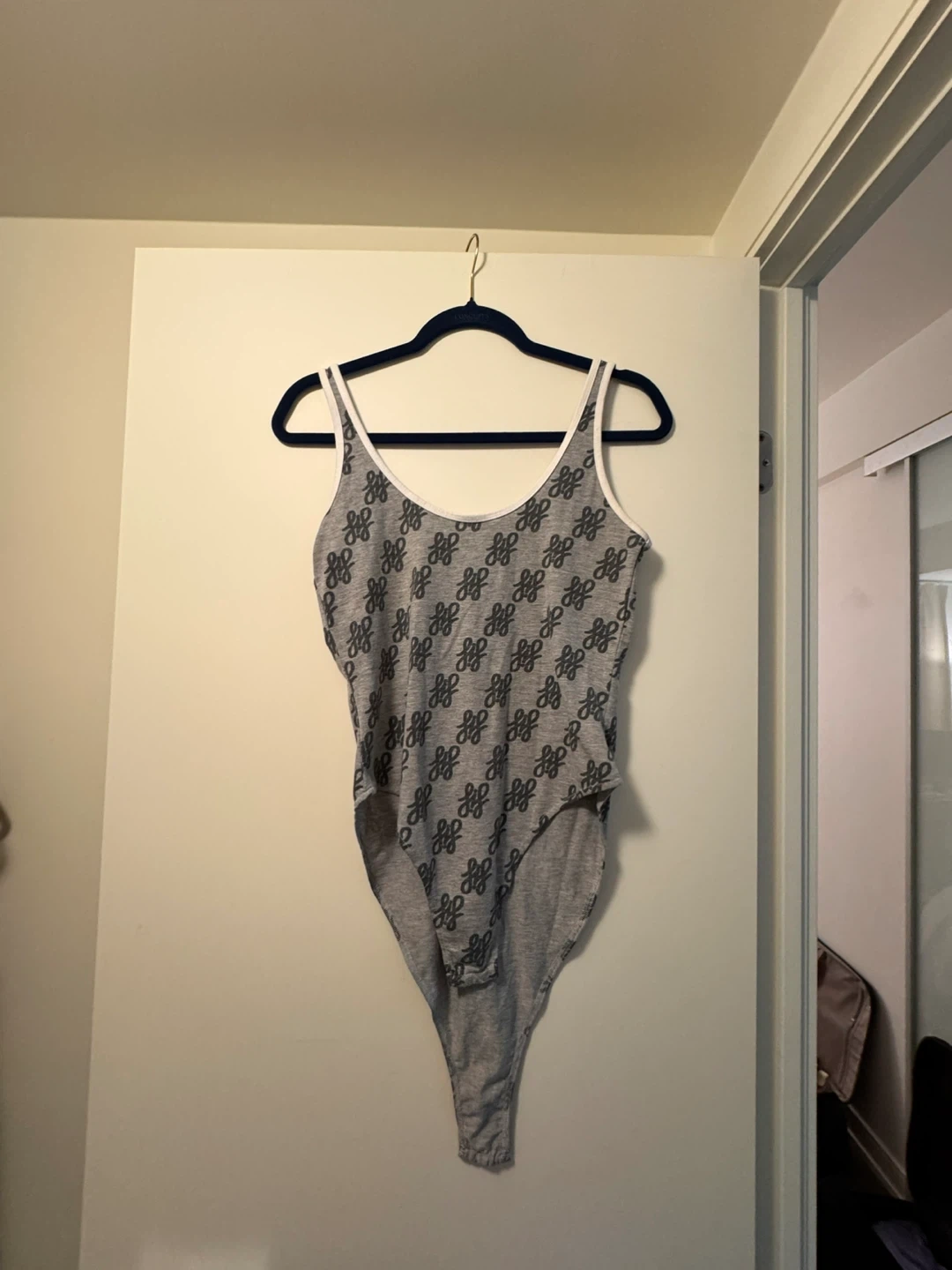 Here's a grey bodysuit with a unique pattern. It's in great condition and ready for a new home! Perfect for layering or wearing on its own
