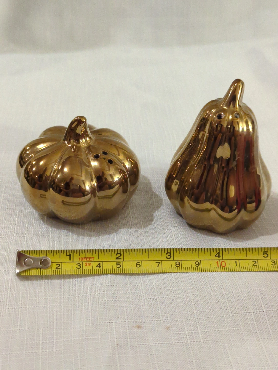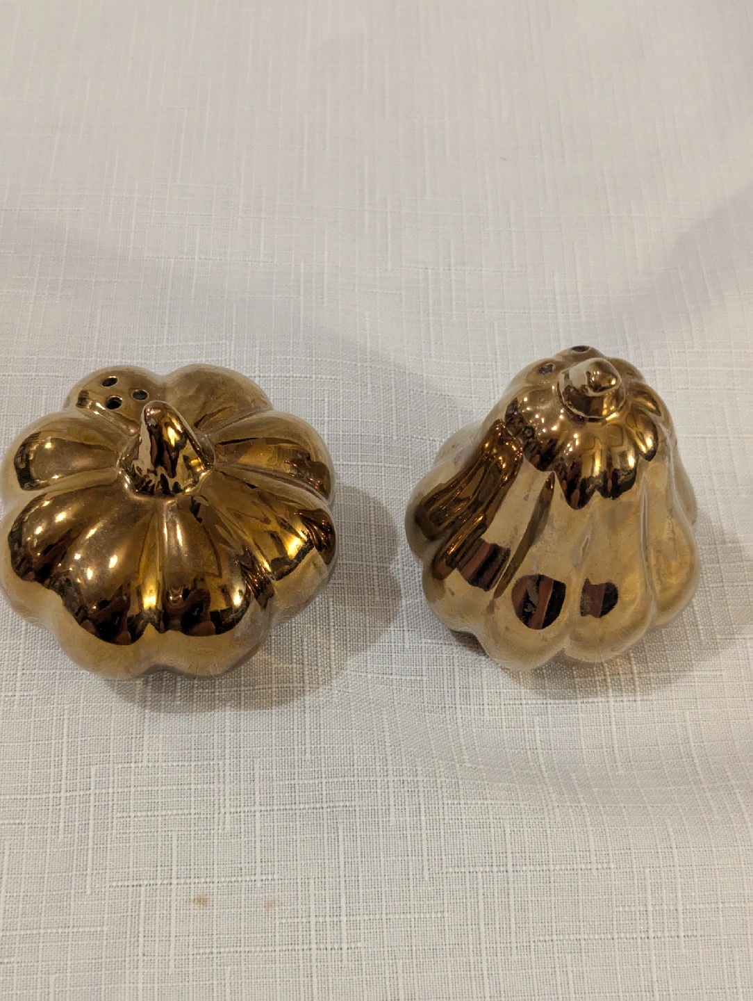 Here's a set of golden salt and pepper shakers, shaped like a pumpkin and a gourd. They're in great condition and would make a lovely addition to any table setting! The height is approximately 3 inches