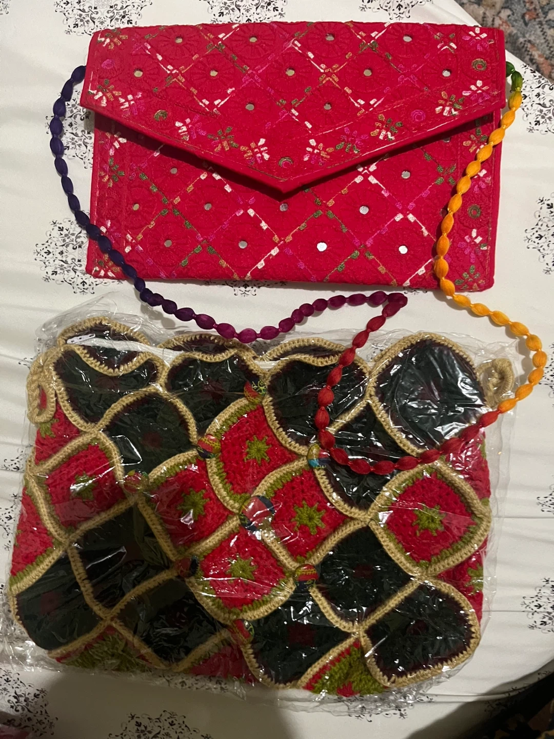 Selling a unique set of handmade bags! Includes a vibrant red embroidered clutch with mirror details and a colourful strap. Also comes with a red and black crochet bag, still in its original packaging. Perfect for adding a pop of colour to any outfit! $50 for both