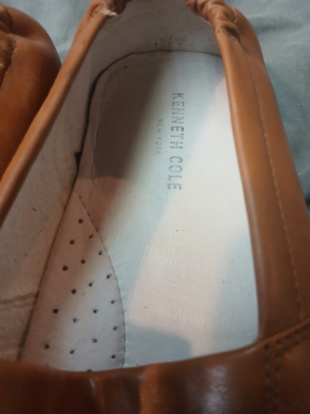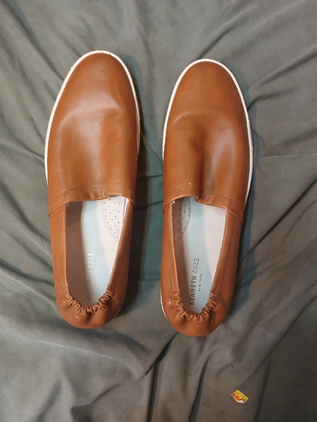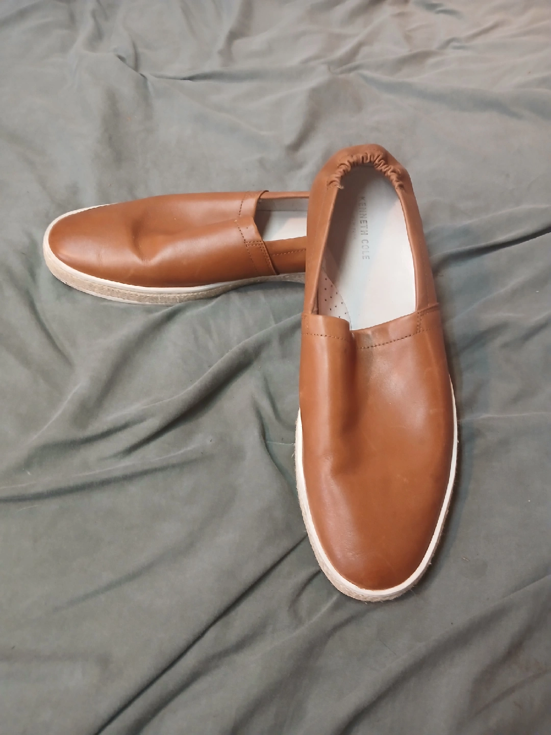 These are a pair of brown leather slip-on shoes from Kenneth Cole. Size 13 .They're in great shape and ready for a new home! The shoes feature a comfortable and stylish design, perfect for everyday wear.