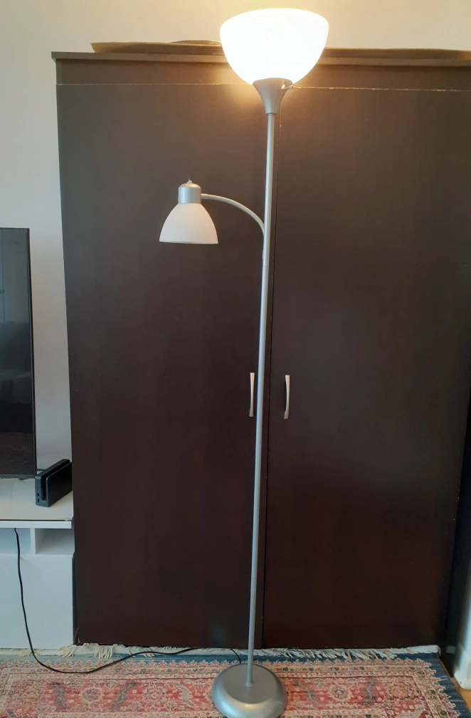 Here's a floor lamp in great condition! It has a main upward-facing light and an adjustable reading light on the side. Perfect for adding some extra light to your living room or bedroom.