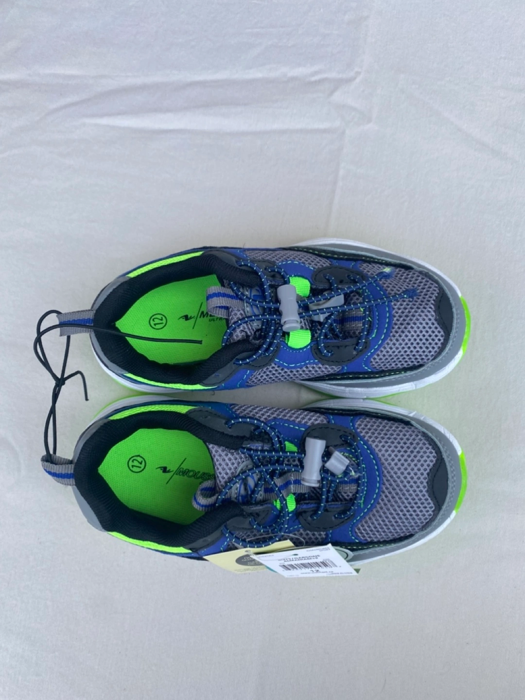 These Athletic Works running shoes for boys are brand new with tags! They are size 12 and feature a stylish grey, blue, and neon green colour scheme. They're perfect for active kids!