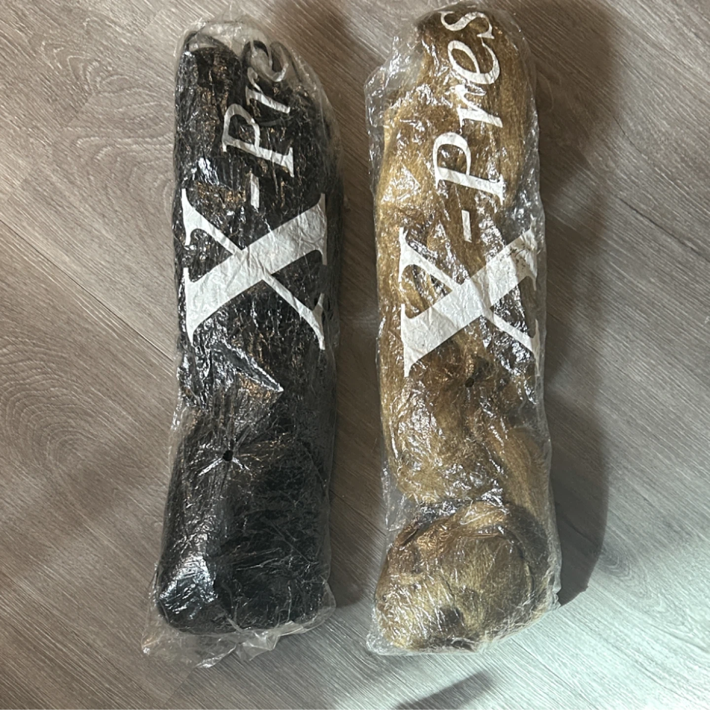 Selling two packs of X-Pression braiding hair! One is black and the other is blonde. Perfect for braids or other hairstyles.