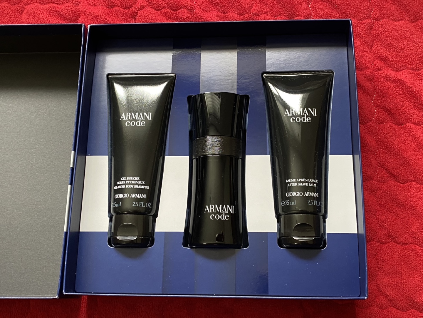 Brand new. Was a gift and would be a great gift to your partner or friend. Smells great, planning to use it if it doesn’t sell. 1.7 oz Spray 2.5 oz After Shave Balm 2.5 oz All Over Shampoo Check out the link: https://www.amazon.ca/Armani-Code-Giorgio-Men-Shampoo/dp/B0859WF12W