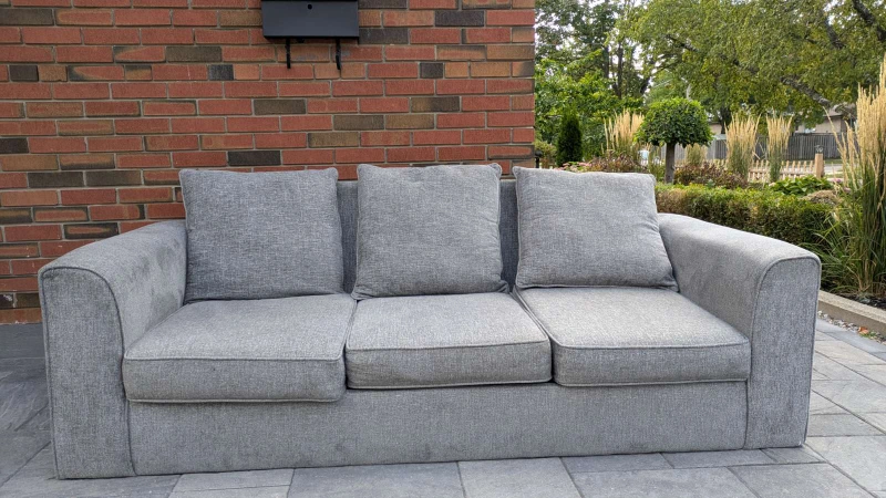 Selling a comfy three-seat sofa in a neutral grey colour. It comes with three matching cushions! It's in great condition and ready for a new home. Perfect for a living room or den