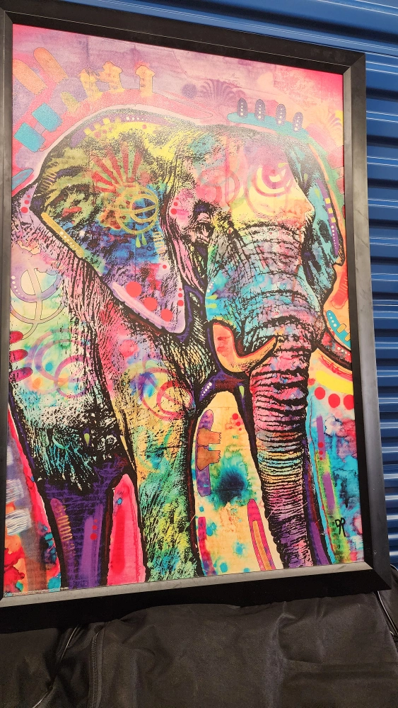 Here's a unique framed print featuring a colourful elephant design. It's in great condition and ready to brighten up any room!