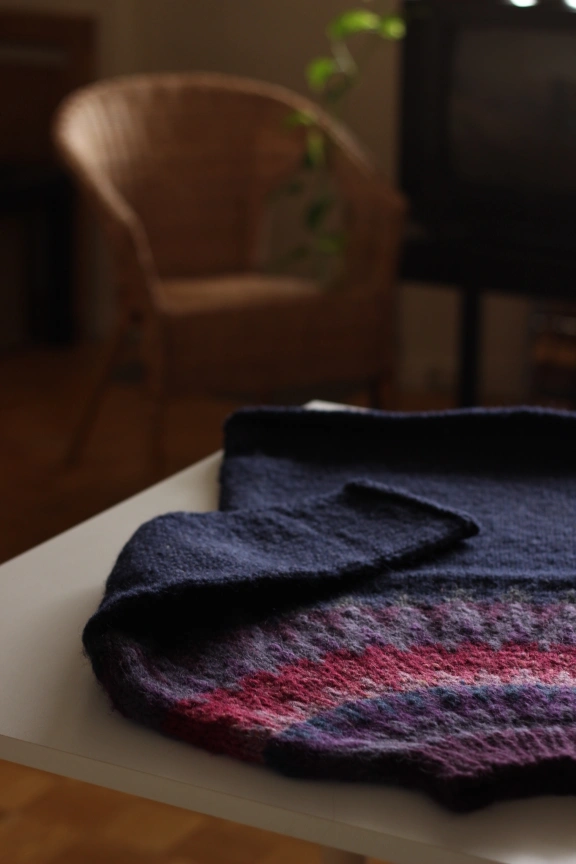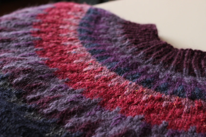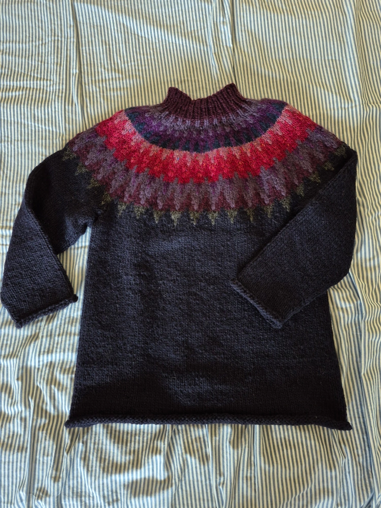 An update to the classic Lopapeysa design, more flattering than the usual tightly gathered cuffs and waist. The patterned yoke draws attention to the face, but the body has been left solid (a contrasting waist stripe has been omitted because no one needs a visual effect that widens them and chops them in two).