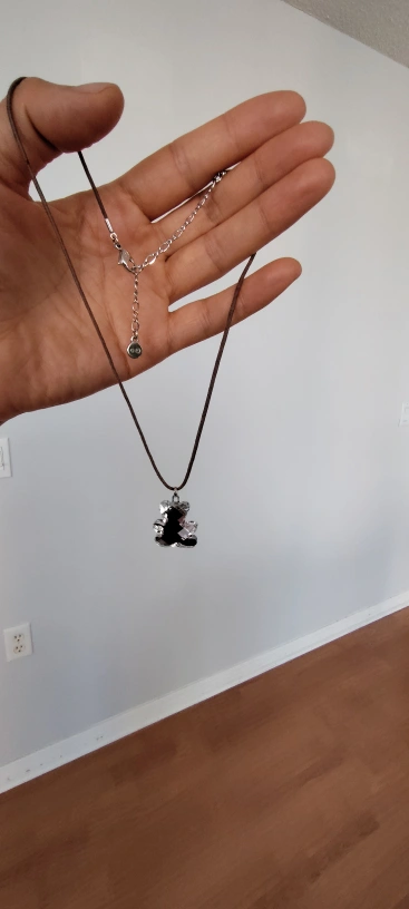 Cute Swarovski teddy bear pendant necklace! The pendant is silver and black and hangs from a brown cord.