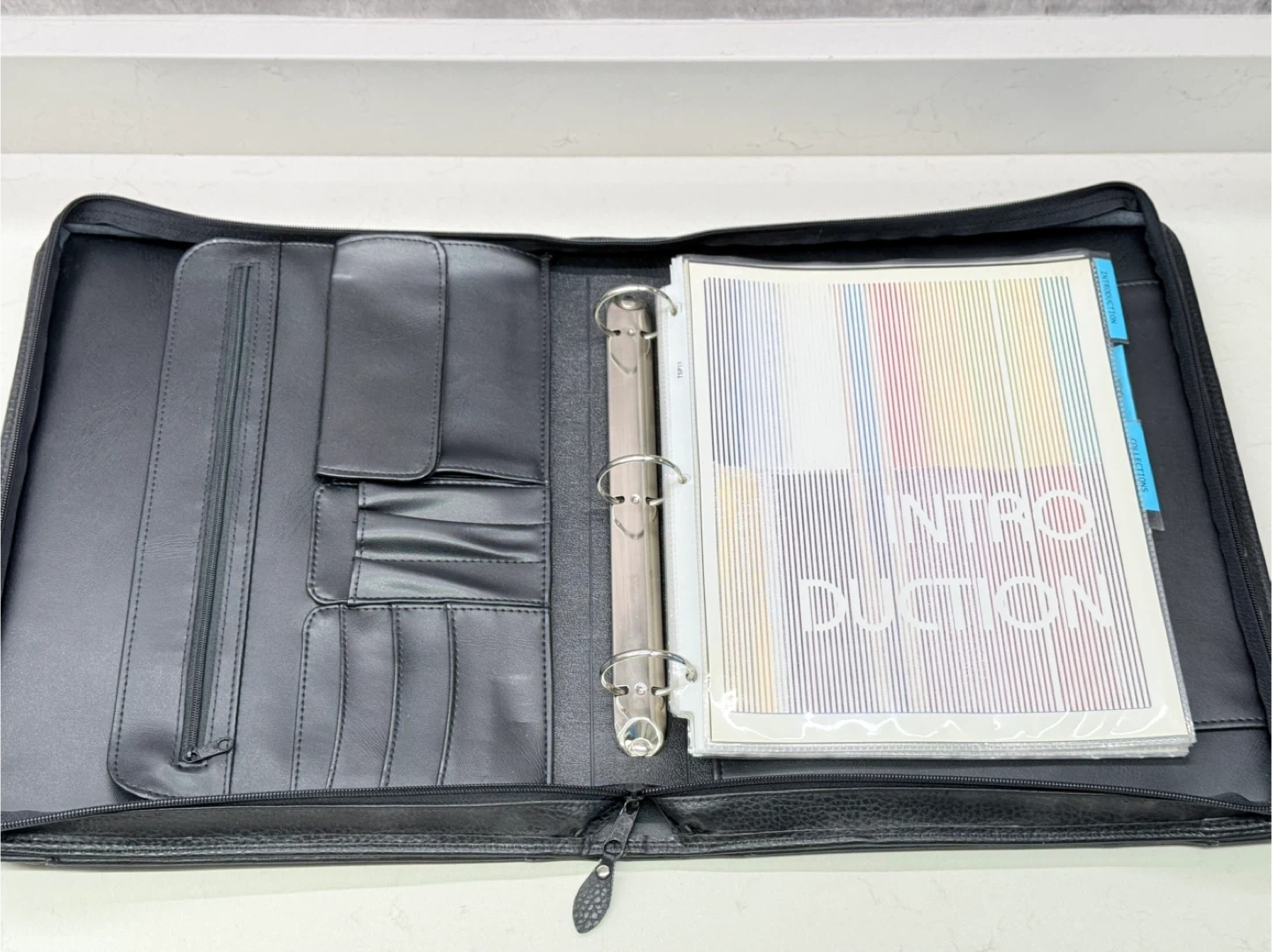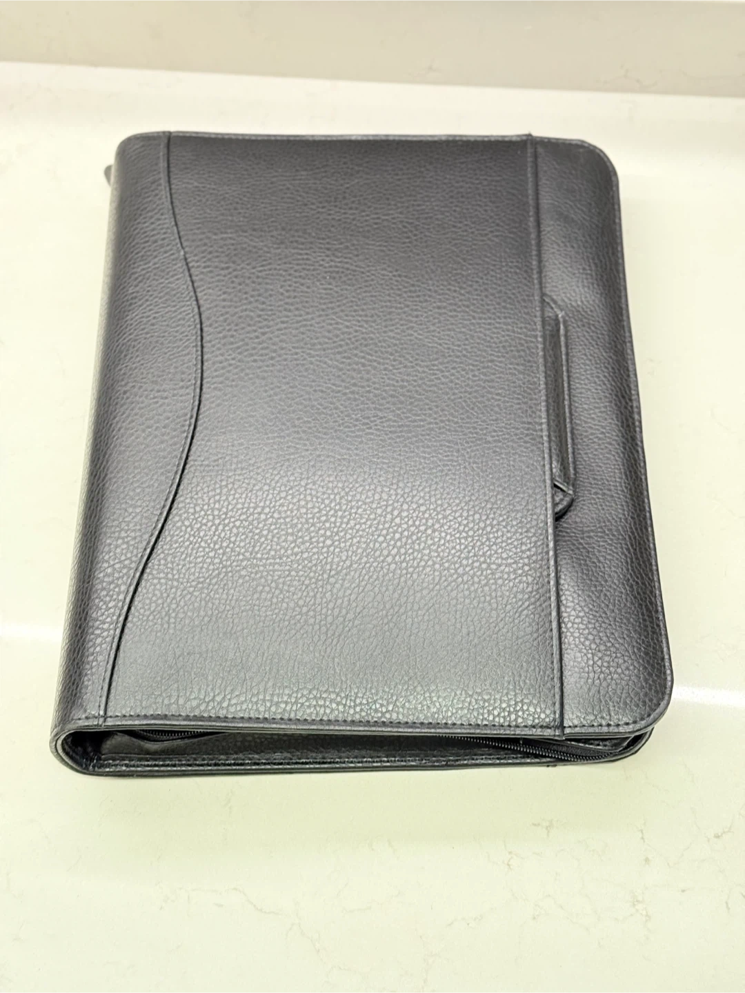 Selling a black leather zippered portfolio binder. It has a retractable handle and lots of pockets inside for organization. Fits laptop too. Great for students or professionals! Just like new, never used. Has a bit of a scuff on one side of cover, see images.