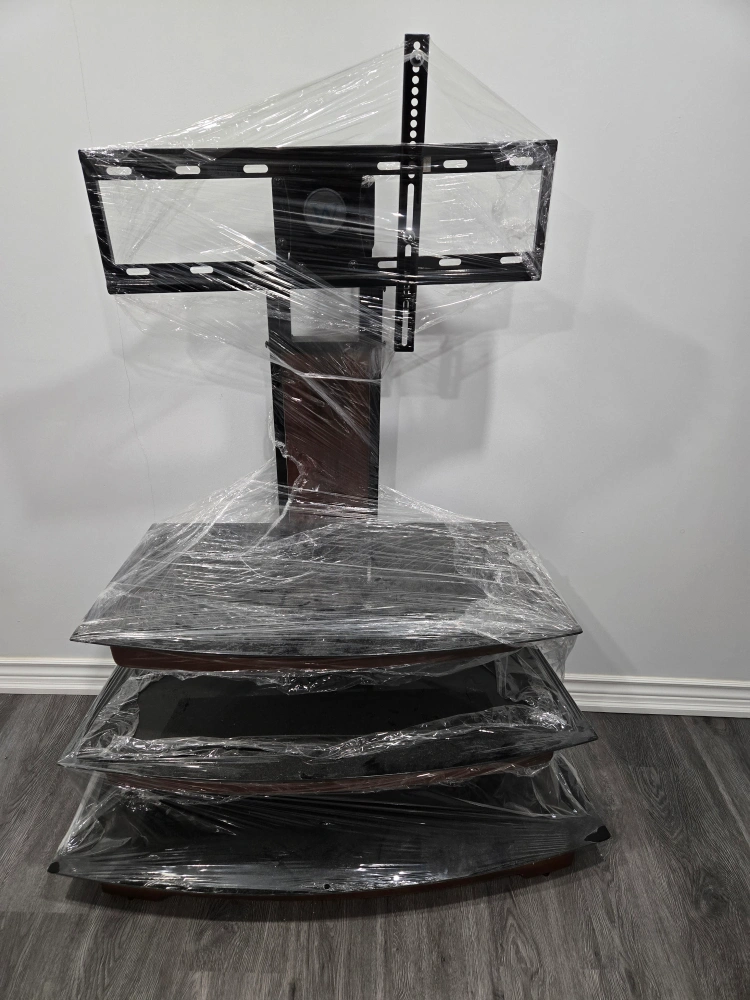 Selling a TV stand with a mount. It has a dark wood finish and three shelves for storage. It has wheels to make it easy for transportation. Still wrapped in plastic.