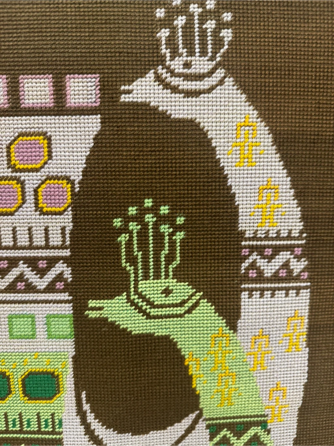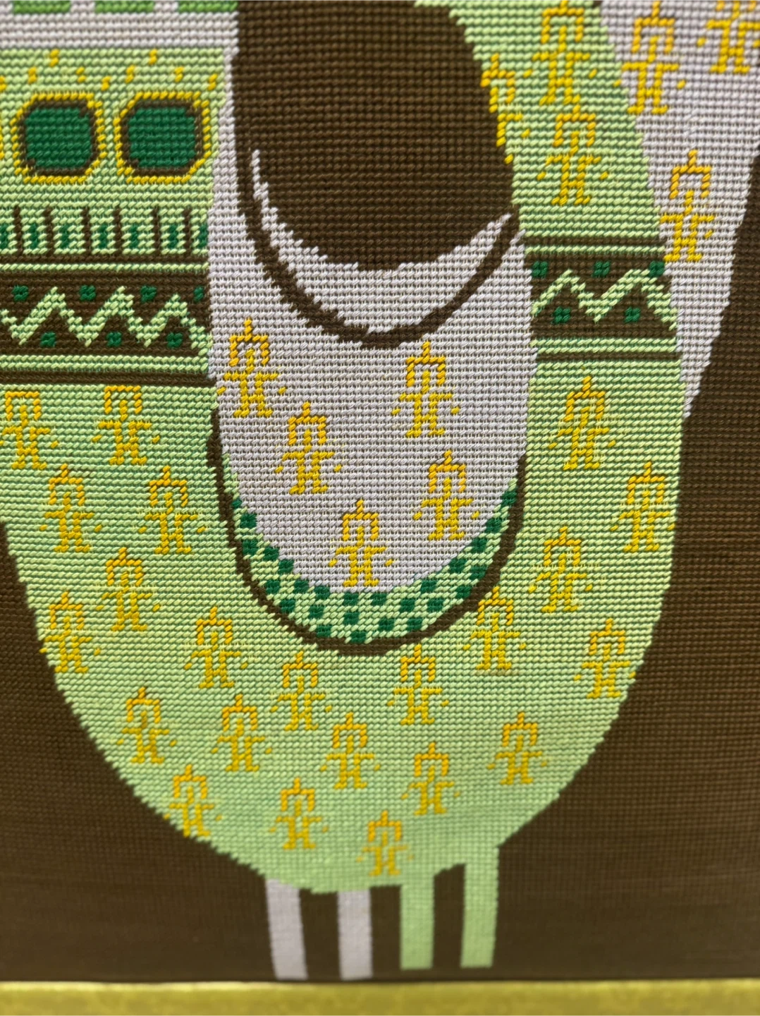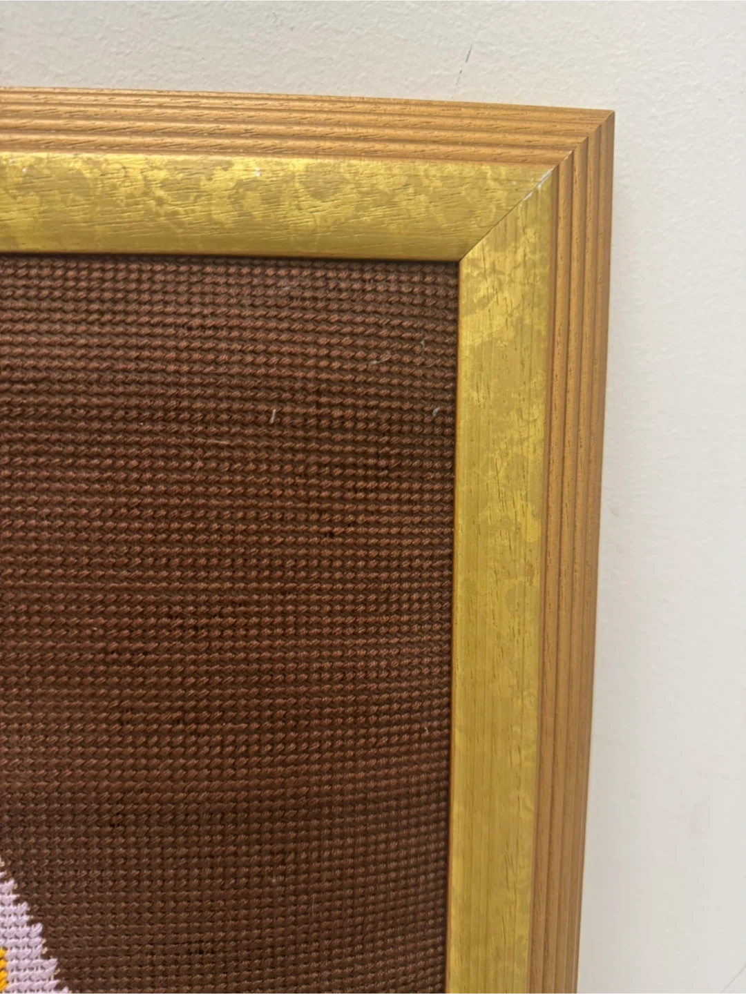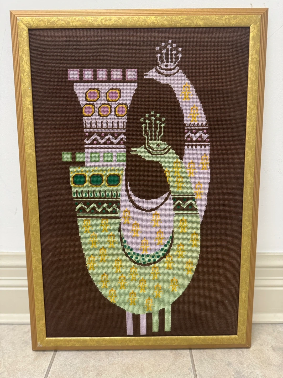 1000+Selling a unique piece of framed needlepoint art! The design features a stylized figure in shades of green, lavender, and yellow, set against a brown background. The frame is a gold colour. It would be a great addition to any room! Cash Pick up near Lawrence and Keele