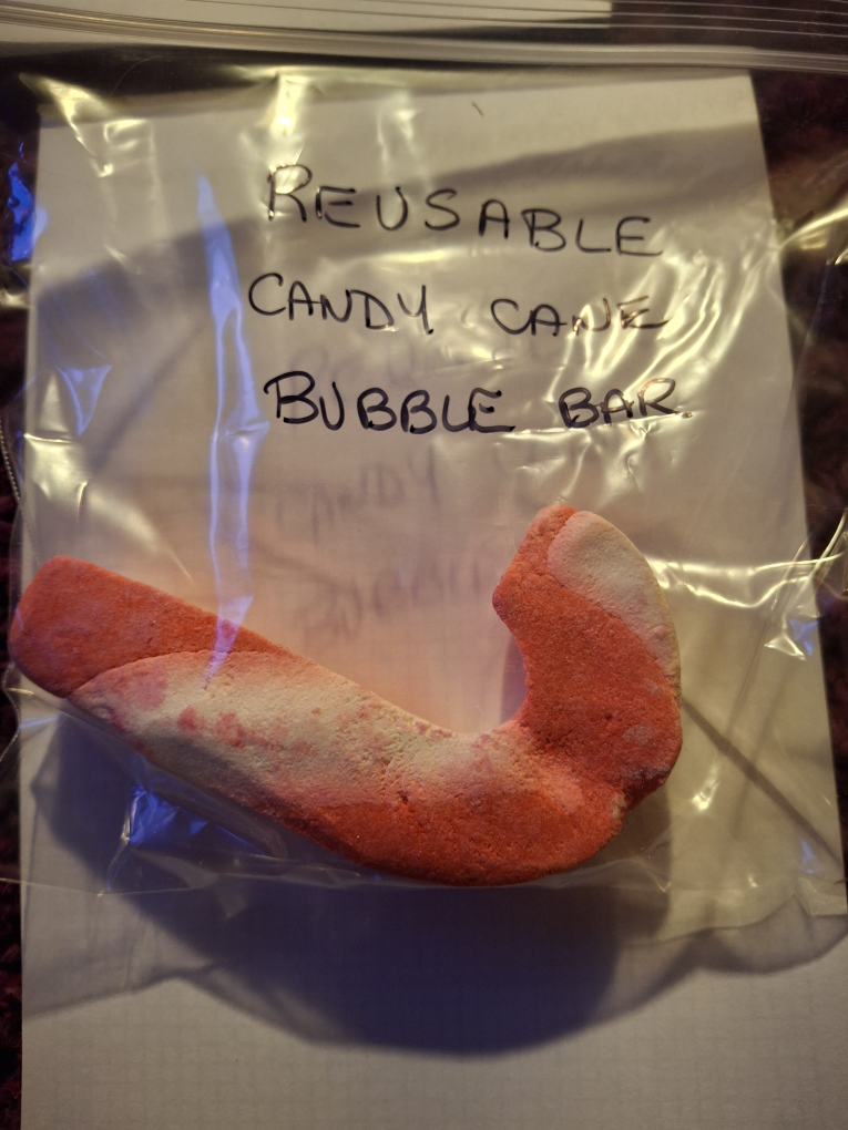 Selling a reusable candy cane bubble bar. It's in a clear plastic bag and looks like a candy cane!