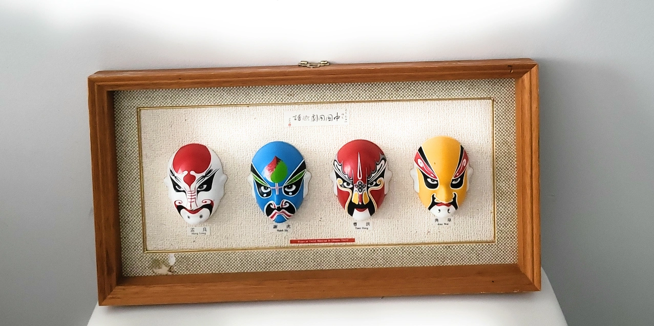 I'm selling a framed set of four Peking Opera masks. They are mounted in a wooden frame with a fabric backing. The masks are colourful and detailed, each representing a different character from Chinese opera. This would be a unique addition to any home!