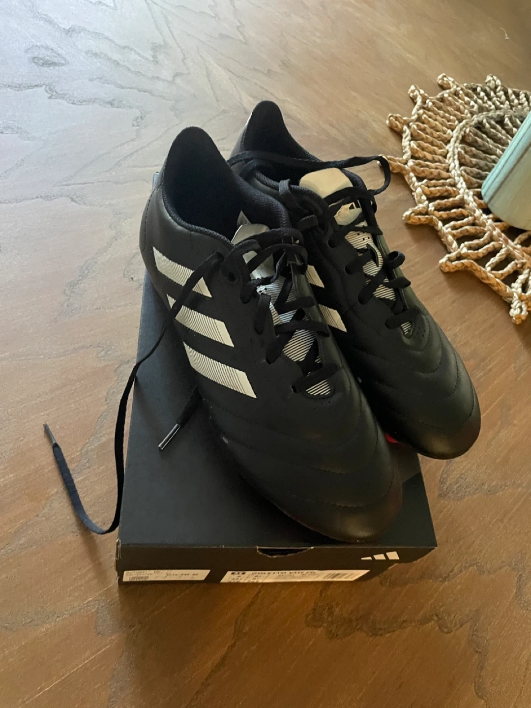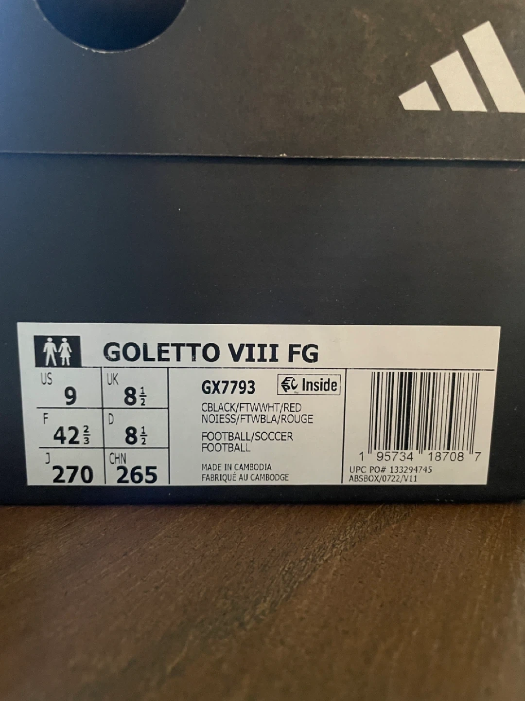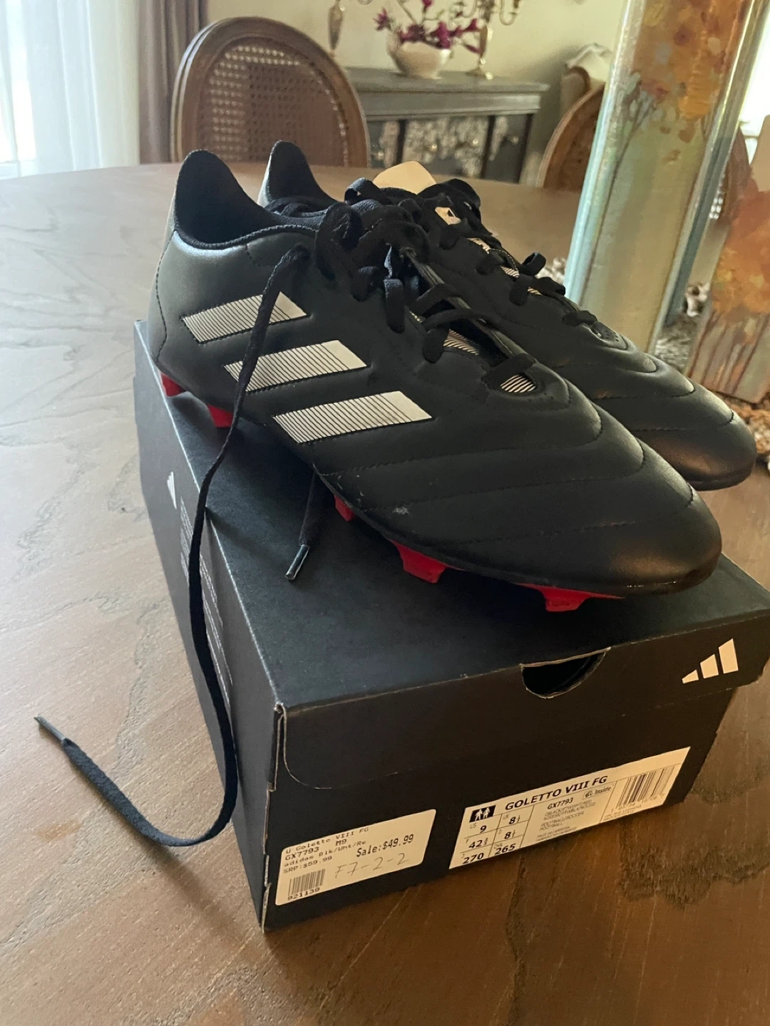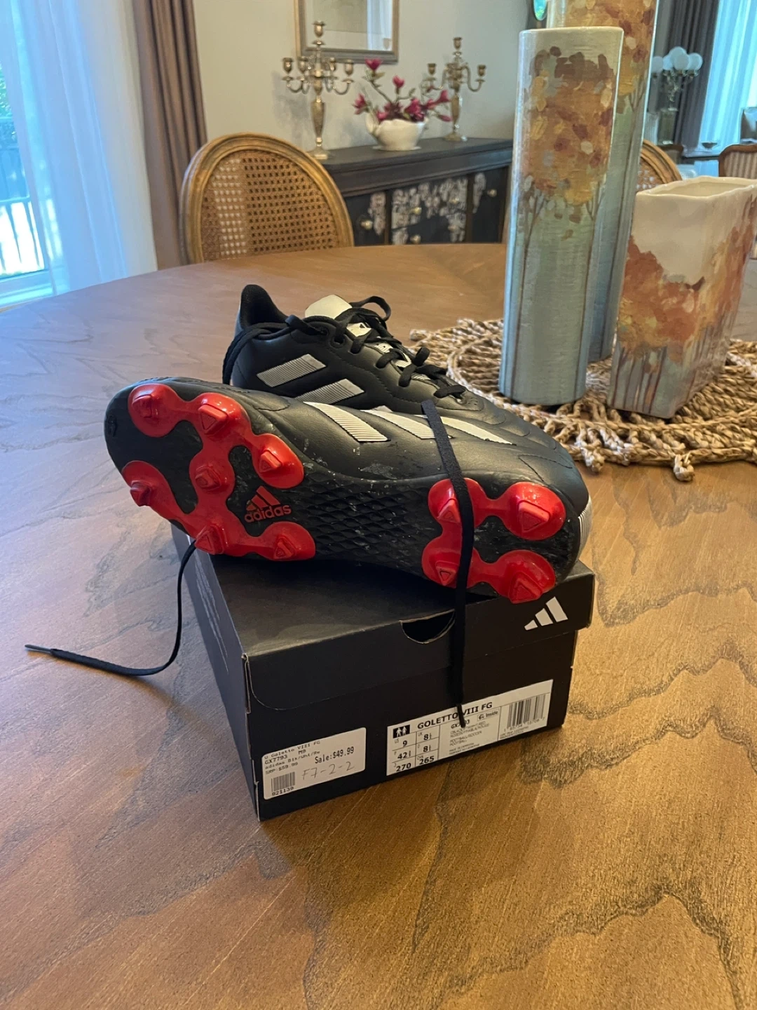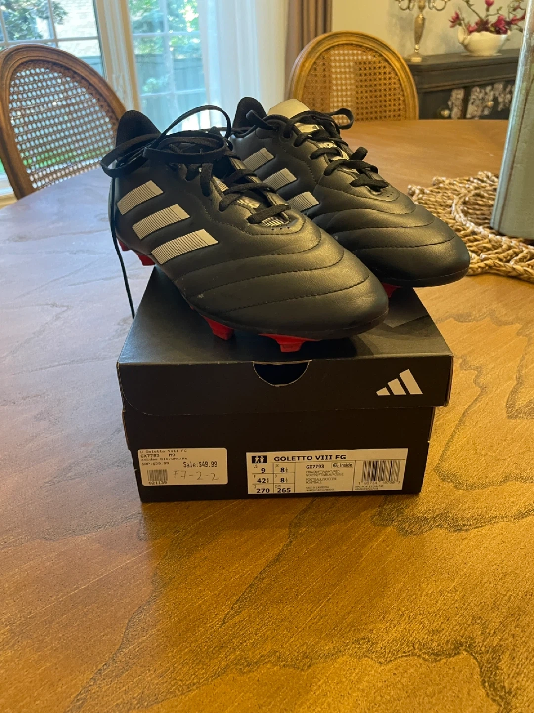 Selling a pair of Adidas Goletto VIII FG soccer cleats in size US 9. These cleats are black with white stripes and red accents on the sole. They come with the original box