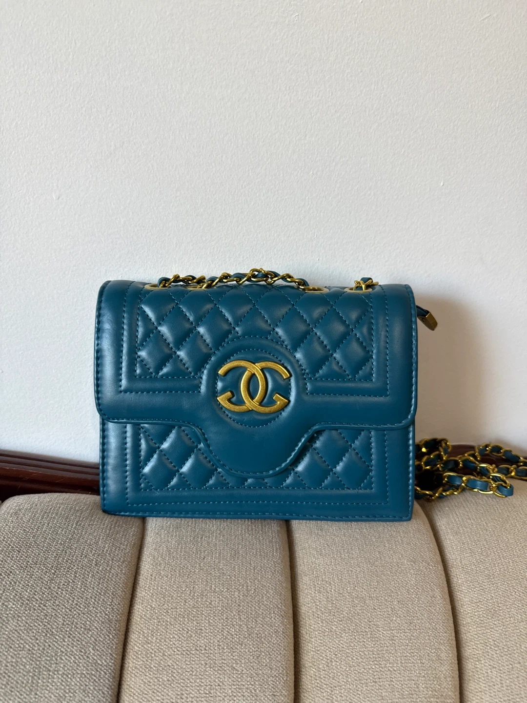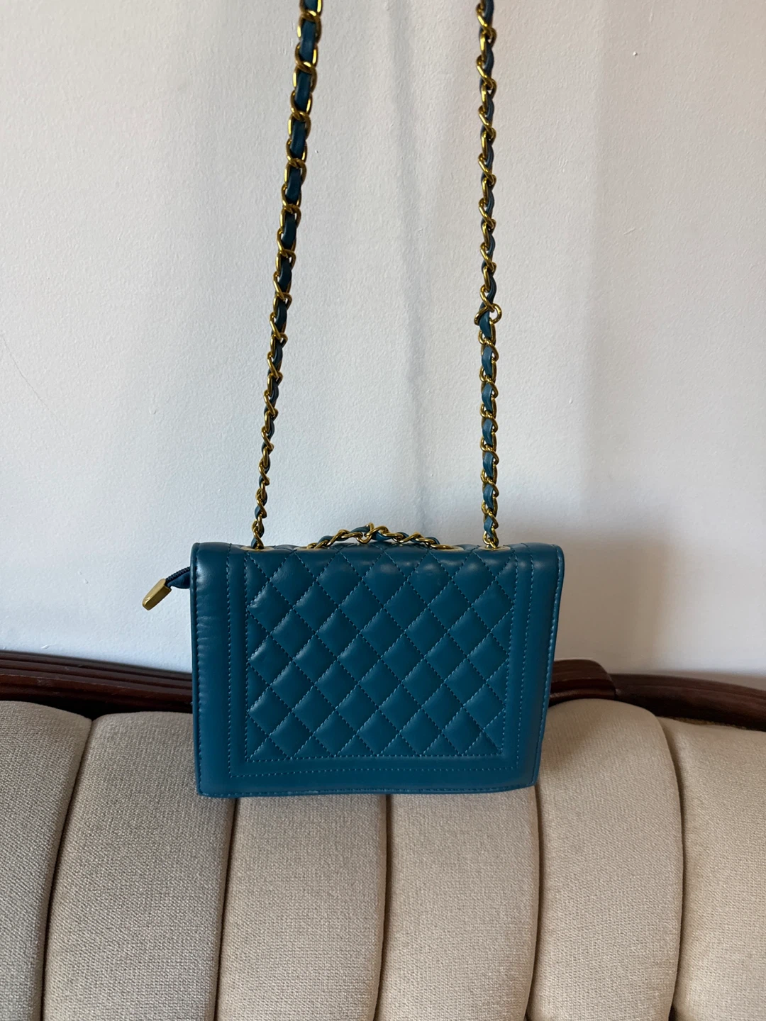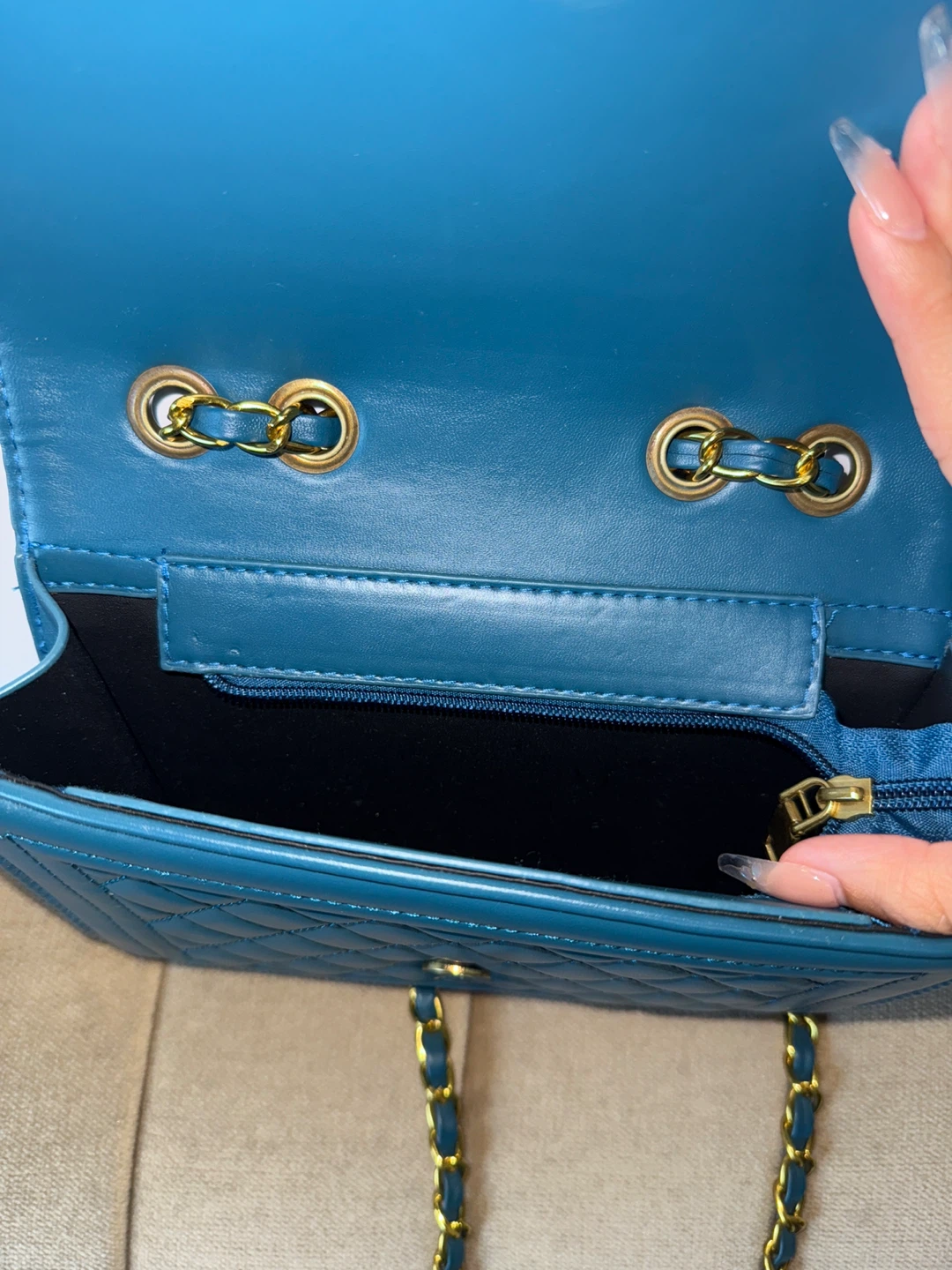 Selling a teal/dark blue quilted shoulder bag with gold chain detailing! It's in great condition and perfect for adding a pop of colour to any outfit