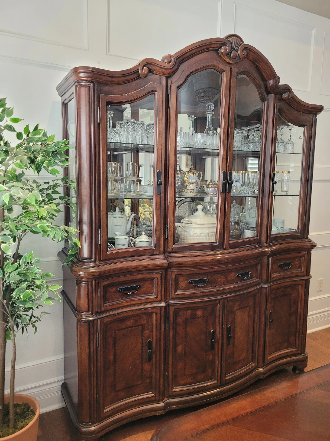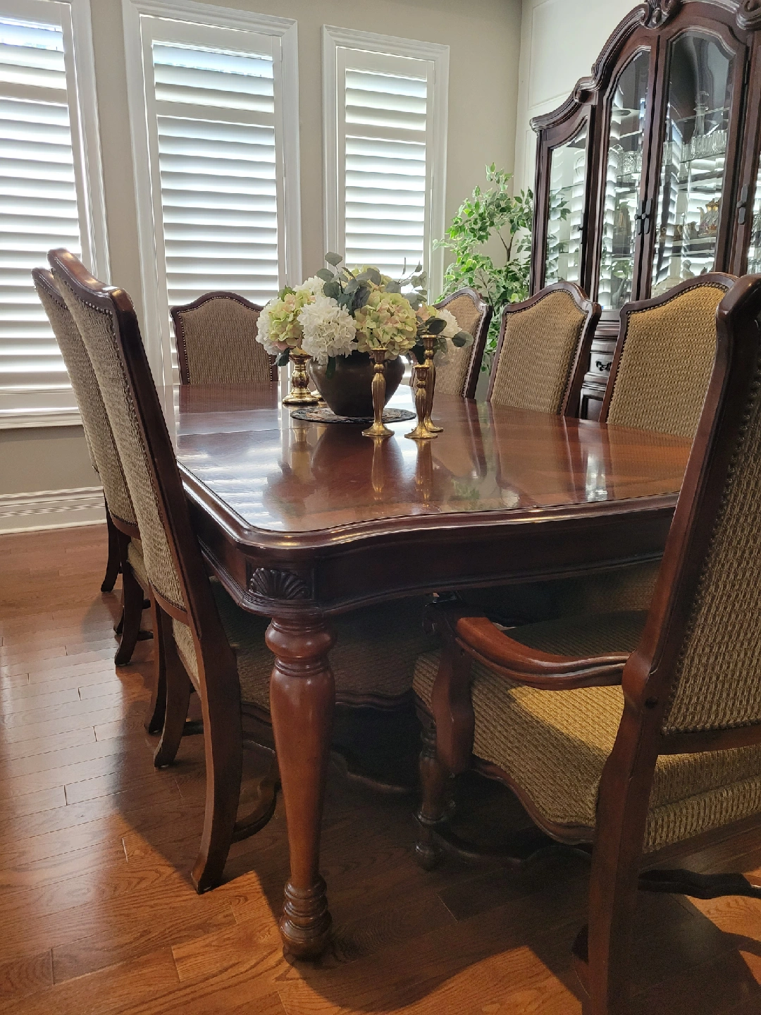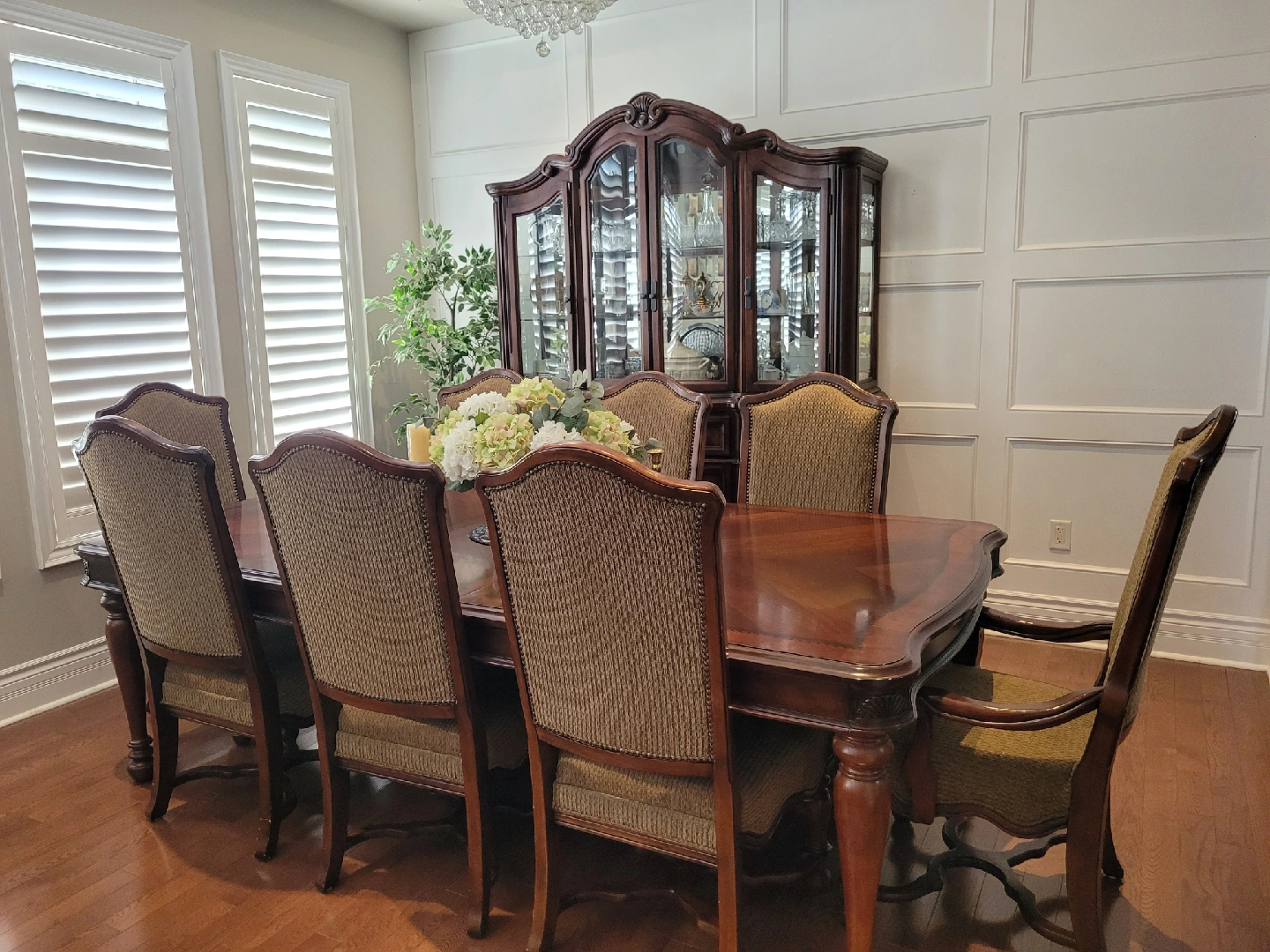 Selling a beautiful wood dining table set with 8 chairs (6 chairs + 2 armchairs) and china cabinet. It's in great shape, the rich wood finish and classic design will add a touch of elegance to your home
