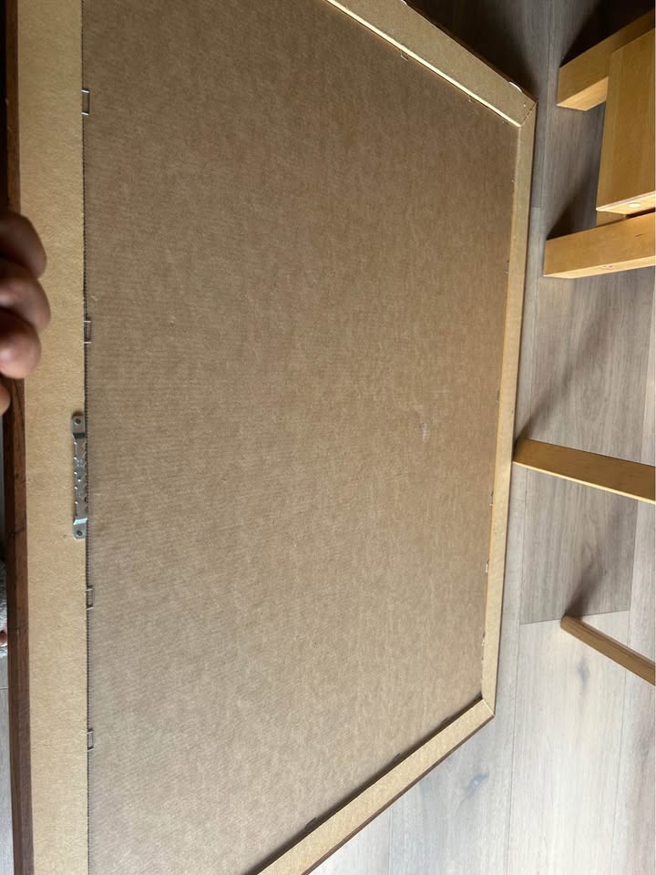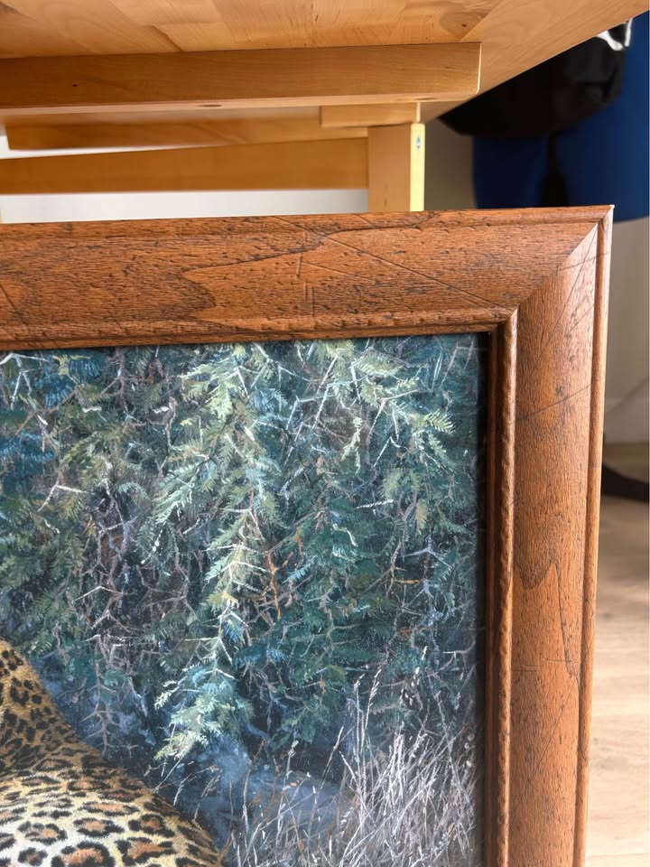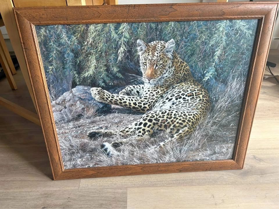 Pickup in river district in South Vancouver. Frame size is 31.5” X 26”. It is a print of the painting “Watchful” by Simon Combes 1994.
