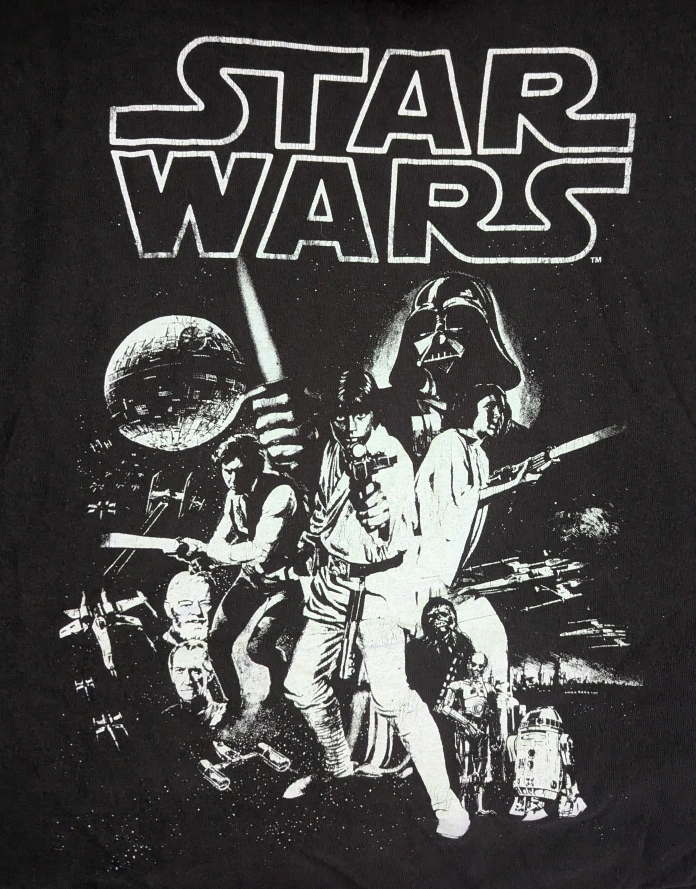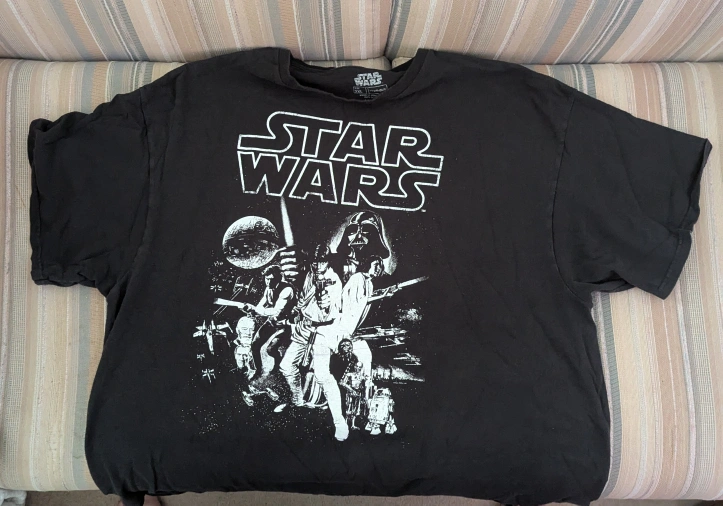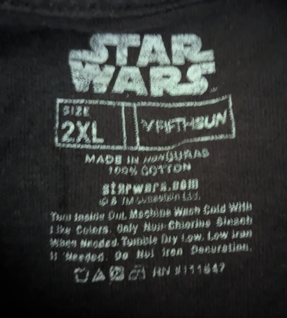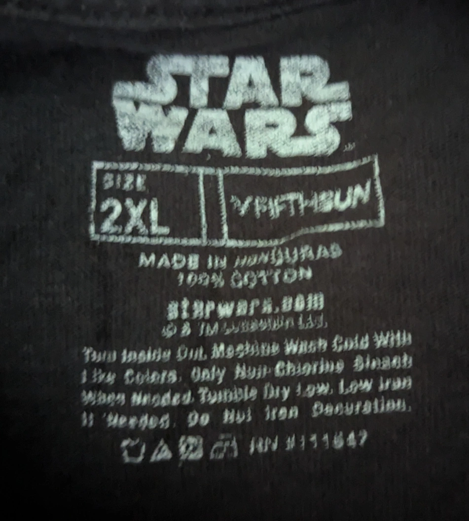 This is a men's black 2XL t-shirt. It shows a classic Star Wars: A New Hope poster in black and white. It is a size 2XL but I feel it runs a little smaller.