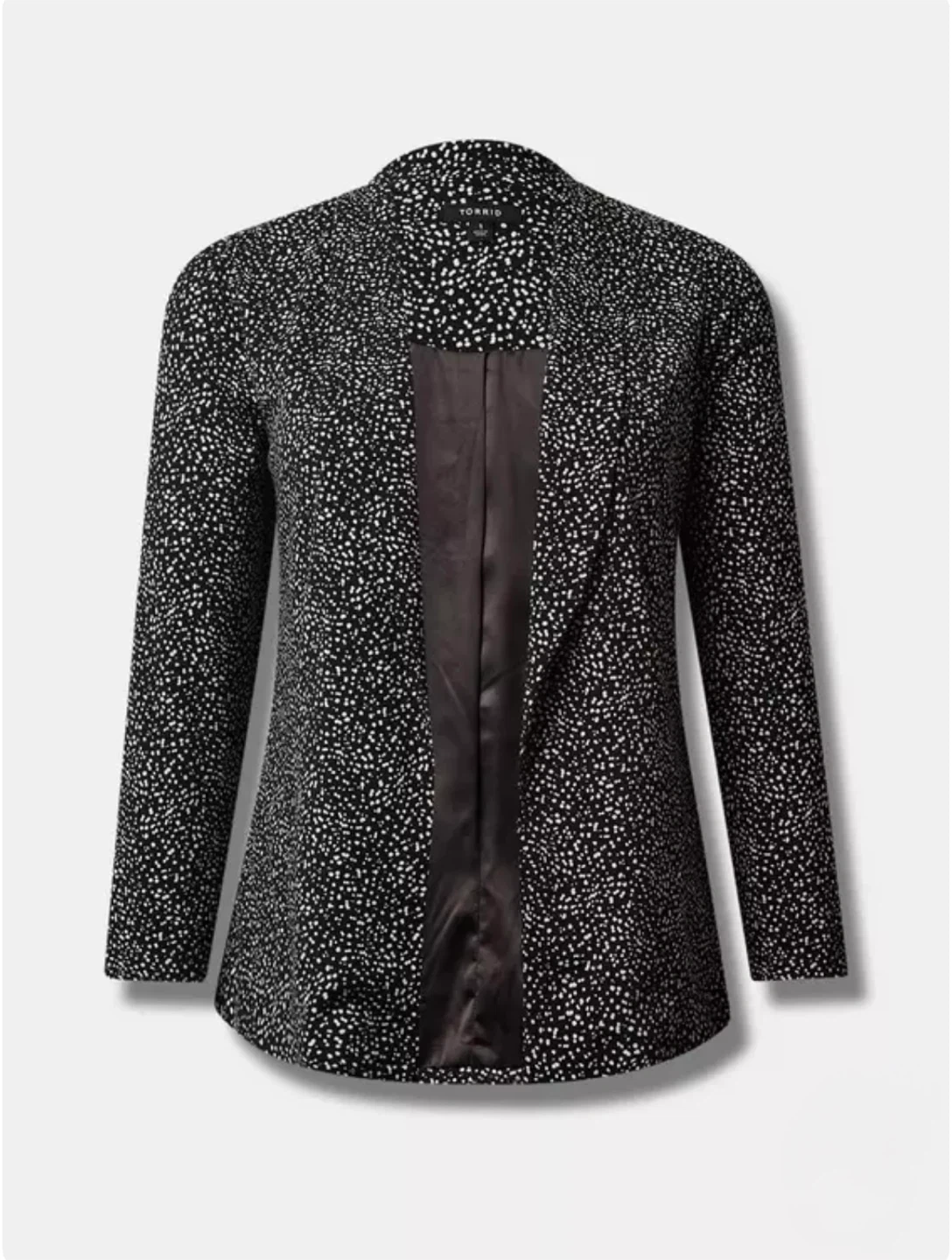 This polished black open-front blazer from Torrid features a playful white mini-dot pattern and a sleek, satin-trimmed lapel. Lightly structured but comfortable, with full-length sleeves and a longer, curve-friendly cut. Perfect for layering over camis, dresses, or workwear.