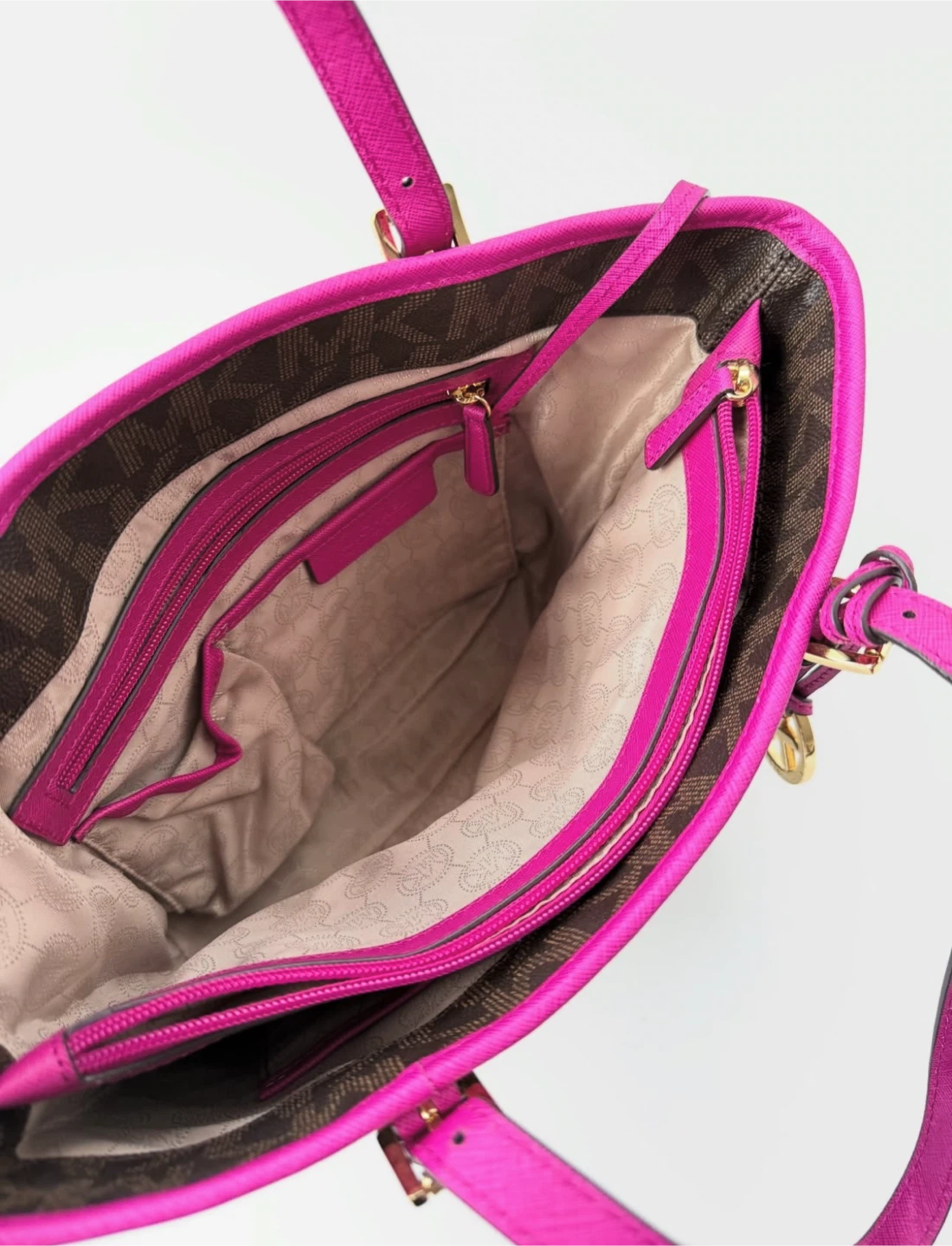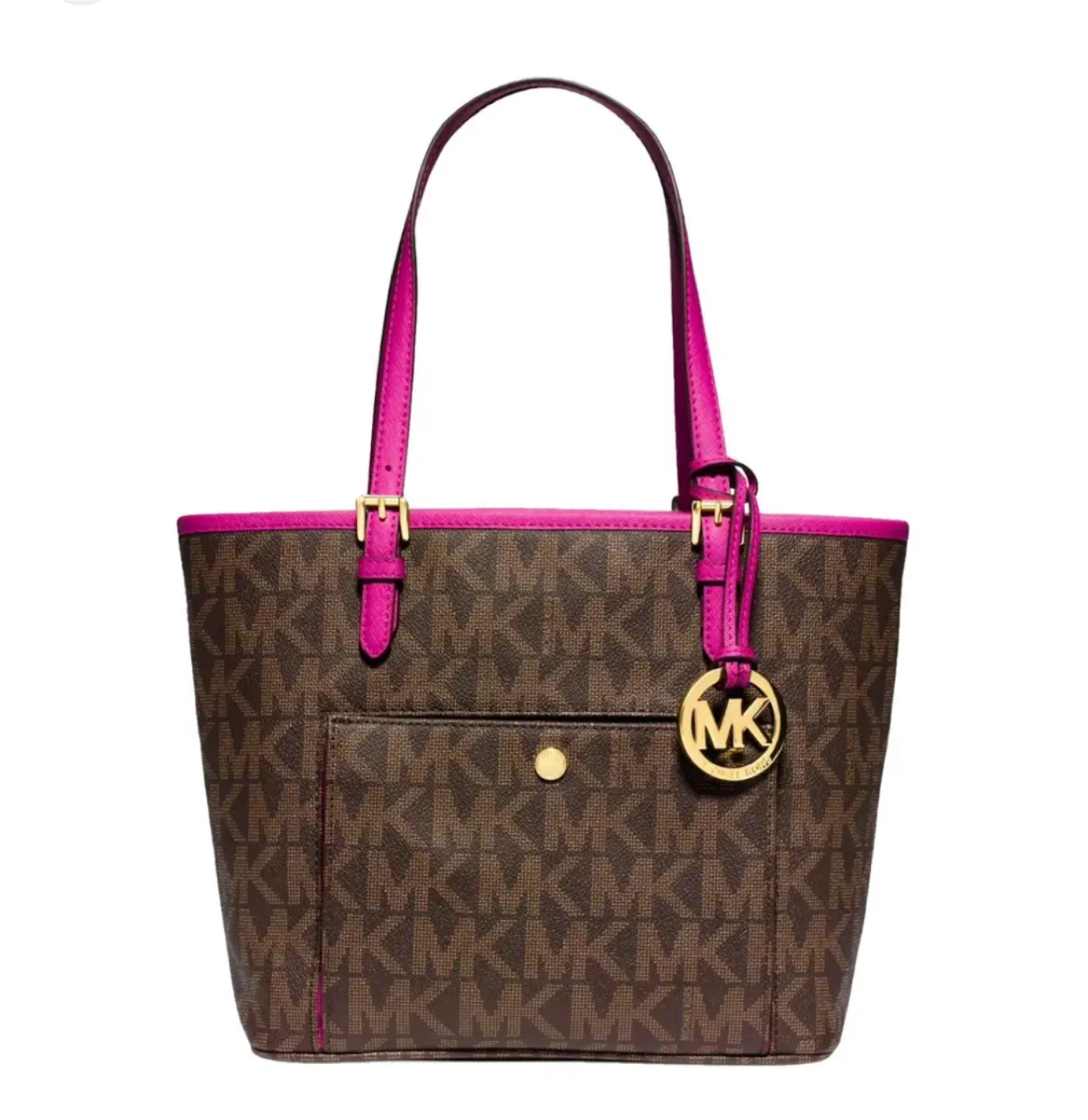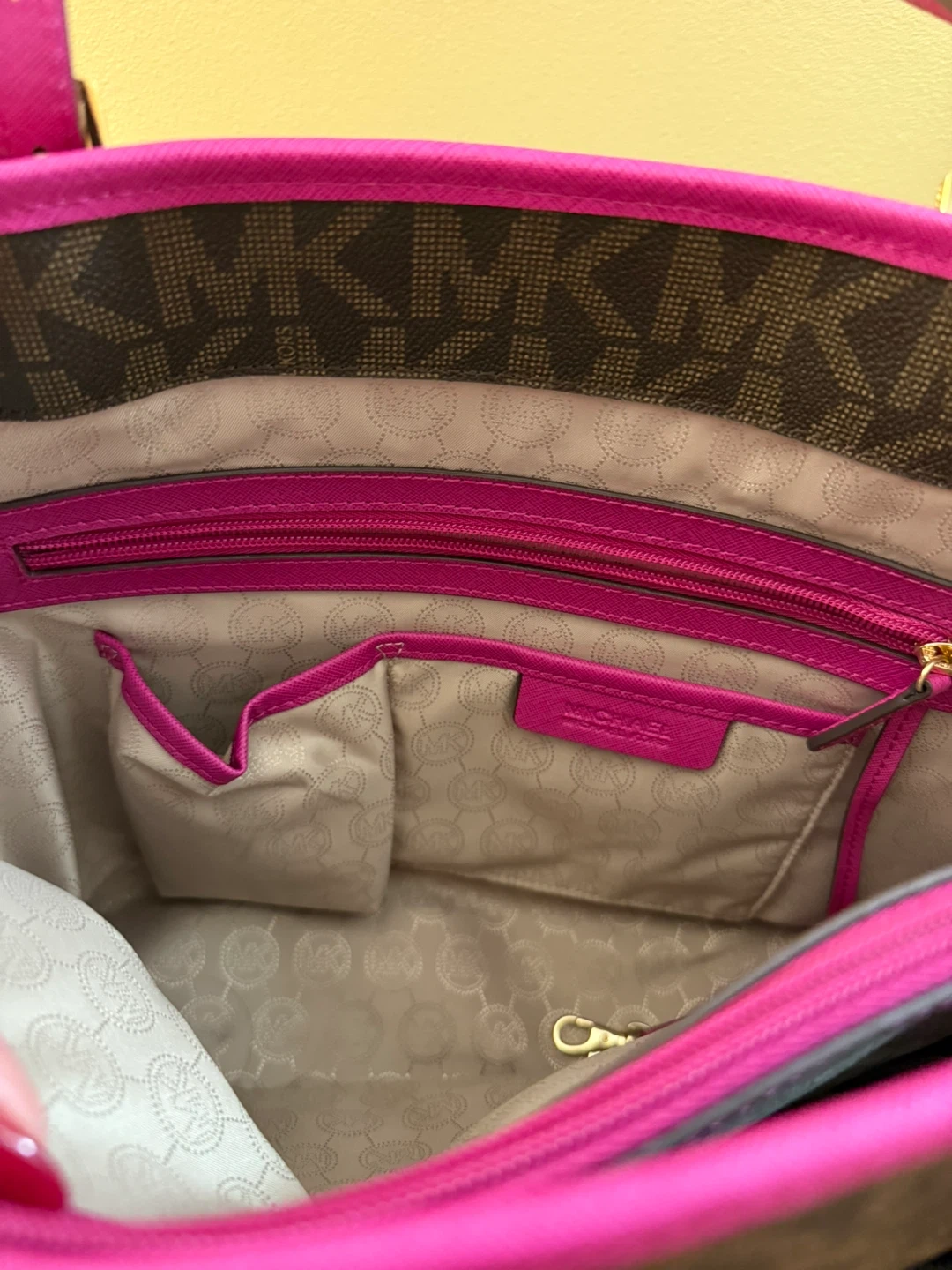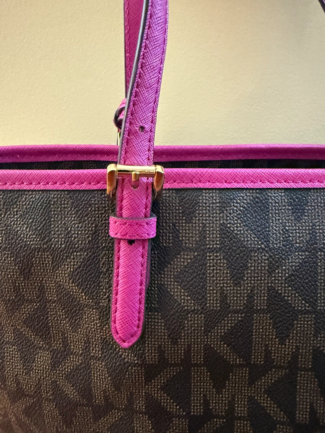 Michael Kors tote bag in a signature brown MK print with vibrant pink accents! It's in great condition and ready for a new home. Perfect for everyday use or as a stylish accessory