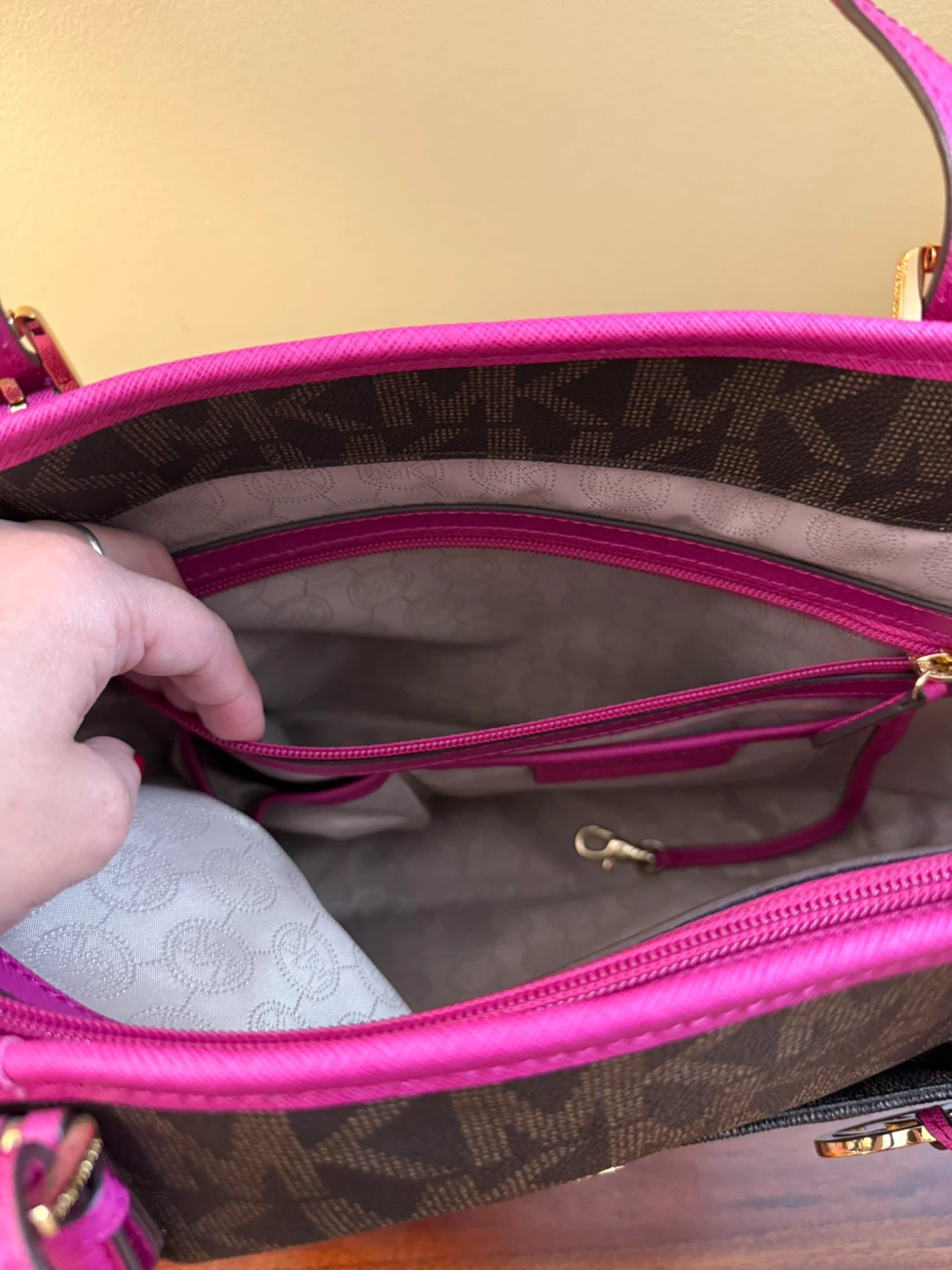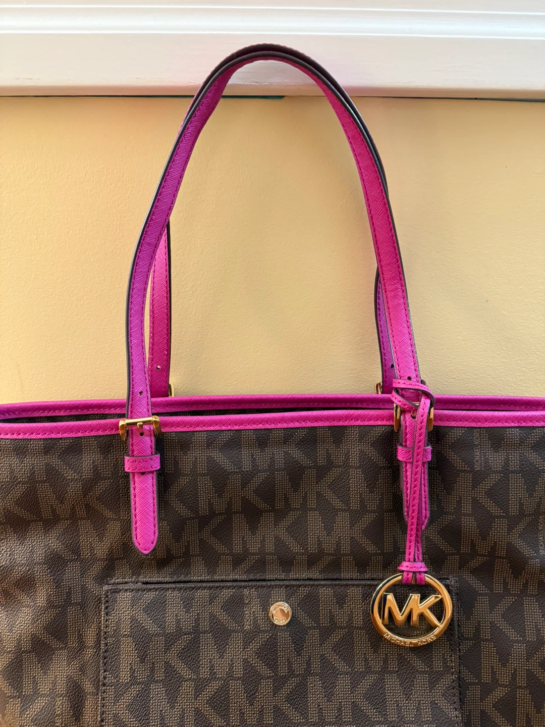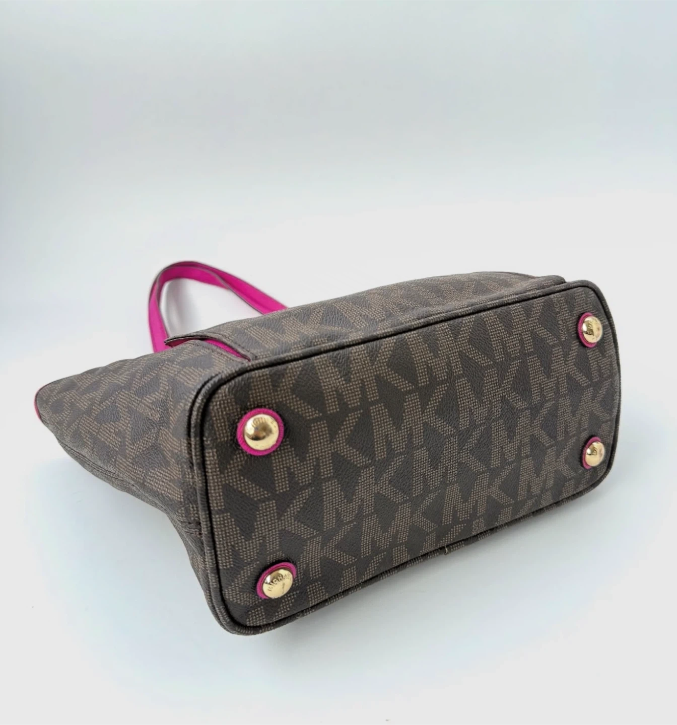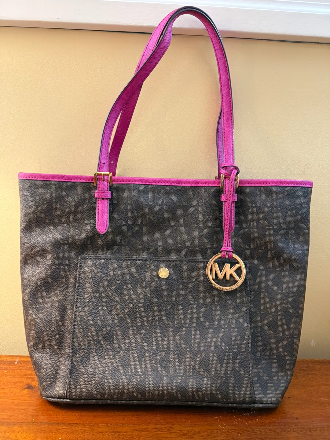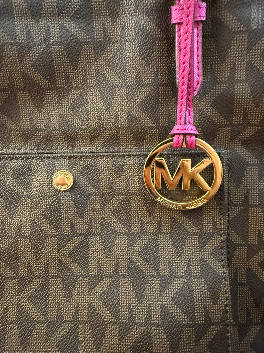 Michael Kors tote bag in a signature brown MK print with vibrant pink accents! It's in great condition and ready for a new home. Perfect for everyday use or as a stylish accessory