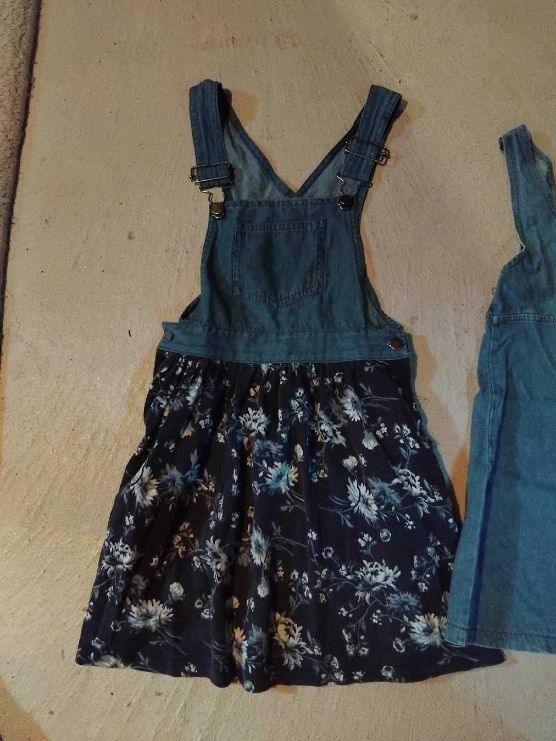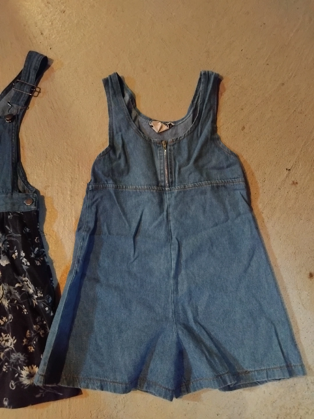 Cute denim jumper dress with a floral pattern on the bottom and second one overall shorts. Perfect for summer!